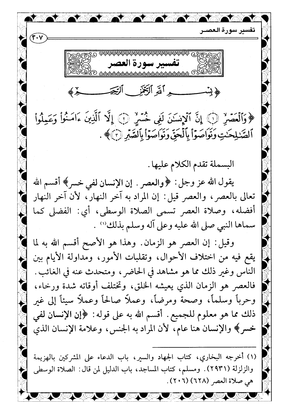 وقيل: إن العصر هو الزمان. وهذا هو الأصح أقسم الله به لما يقع فيه من اختلاف الأحوال، وتقلبات الأمور، ومداولة الأيام بين الناس وغير ذلك مما هو مشاهد في الحاضر، ومتحدث عنه في الغائب. فالعصر هو الزمان الذي يعيشه الخلق، وتختلف أوقاته شدة ورخاء، وحرباً وسلماً، وصحة ومرضاً، وعملاً صالحاً وعملاً سيئاً إلى غير ذلك مما هو معلوم للجميع. أقسم الله به على قوله: {إن الإنسان لفي خسر} والإنسان هنا عام، لأن المراد به الجنس، وعلامة الإنسان الذي