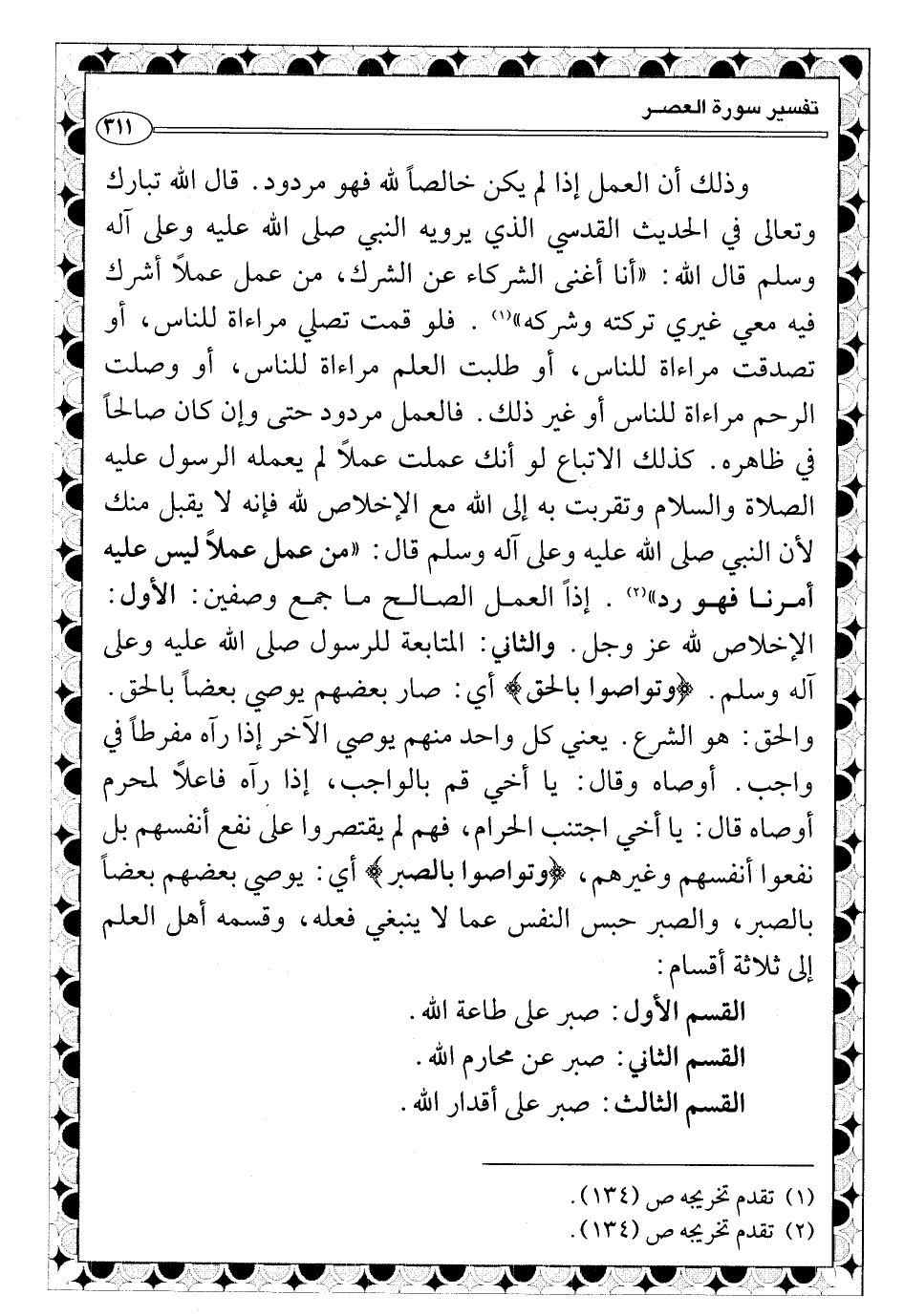 وذلك أن العمل إذا لم يكن خالصاً لله فهو مردود. قال الله تبارك وتعالى في الحديث القدسي الذي يرويه النبي صلى الله عليه وعلى آله وسلم قال الله: «أنا أغنى الشركاء عن الشرك، من عمل عملاً أشرك فيه معي غيري تركته وشركه» (¬1) . فلو قمت تصلي مراءاة للناس، أو تصدقت مراءاة للناس، أو طلبت العلم مراءاة للناس، أو وصلت الرحم مراءاة للناس أو غير ذلك. فالعمل مردود حتى وإن كان صالحاً في ظاهره. كذلك الاتباع لو أنك عملت عملاً لم يعمله الرسول عليه الصلاة والسلام وتقربت به إلى الله مع الإخلاص لله فإنه لا يقبل منك لأن النبي صلى الله عليه وعلى آله وسلم قال: «من عمل عملاً ليس عليه أمرنا فهو رد» (¬2) . إذاً العمل الصالح ما جمع وصفين: الأول: الإخلاص لله عز وجل. والثاني: المتابعة للرسول صلى الله عليه وعلى آله وسلم. الصفة الثالثة {وتواصوا بالحق} أي: صار بعضهم يوصي بعضاً بالحق. والحق: هو الشرع. يعني كل واحد منهم يوصي الآخر إذا رآه مفرطاً في واجب. أوصاه وقال: يا أخي قم بالواجب، إذا رآه فاعلاً لمحرم أوصاه قال: يا أخي اجتنب الحرام، فهم لم يقتصروا على نفع أنفسهم بل نفعوا أنفسهم وغيرهم، الصفة الرابعة {وتواصوا بالصبر} أي: يوصي بعضهم بعضاً بالصبر، والصبر حبس النفس عما لا ينبغي فعله، وقسمه أهل العلم إلى ثلاثة أقسام: