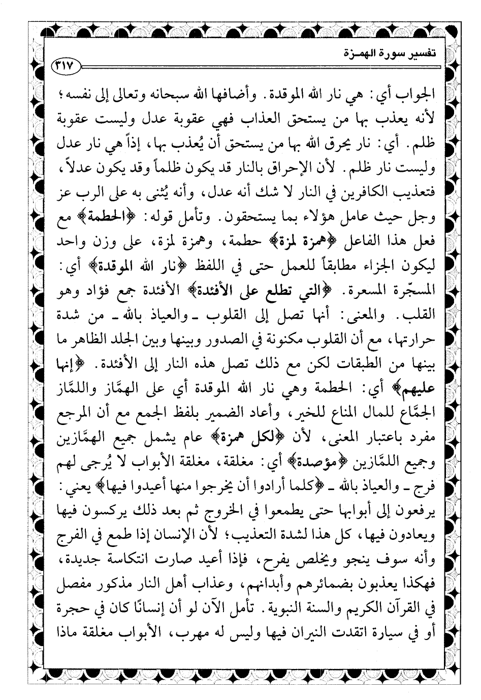 الجواب أي: هي نار الله الموقدة. وأضافها الله سبحانه وتعالى إلى نفسه؛ لأنه يعذب بها من يستحق العذاب فهي عقوبة عدل وليست عقوبة ظلم. أي: نار يحرق الله بها من يستحق أن يُعذب بها، إذاً هي نار عدل وليست نار ظلم. لأن الإحراق بالنار قد يكون ظلماً وقد يكون عدلاً، فتعذيب الكافرين في النار لا شك أنه عدل، وأنه يُثنى به على الرب عز وجل حيث عامل هؤلاء بما يستحقون. وتأمل قوله: {الحطمة} مع فعل هذا الفاعل {همزة لمزة} حطمة، وهمزة لمزة، على وزن واحد ليكون الجزاء مطابقاً للعمل حتى في اللفظ {نار الله الموقدة} أي: المسجّرة المسعرة. {التي تطلع على الأفئدة} الأفئدة جمع فؤاد وهو القلب. والمعنى: أنها تصل إلى القلوب ـ والعياذ بالله ـ من شدة حرارتها، مع أن القلوب مكنونة في الصدور وبينها وبين الجلد الظاهر ما بينها من الطبقات لكن مع ذلك تصل هذه النار إلى الأفئدة.