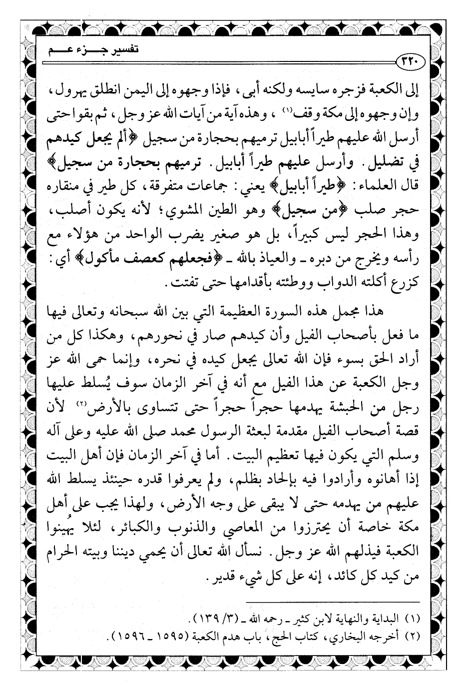 هذا مجمل هذه السورة العظيمة التي بين الله سبحانه وتعالى فيها ما فعل بأصحاب الفيل وأن كيدهم صار في نحورهم، وهكذا كل من أراد الحق بسوء فإن الله تعالى يجعل كيده في نحره، وإنما حمى الله عز وجل الكعبة عن هذا الفيل مع أنه في آخر الزمان سوف يُسلط عليها رجل من الحبشة يهدمها حجراً حجراً حتى تتساوى بالأرض (¬2) لأن قصة أصحاب الفيل مقدمة لبعثة الرسول محمد صلى الله عليه وعلى آله وسلم التي يكون فيها تعظيم البيت. أما في آخر الزمان فإن أهل البيت إذا أهانوه وأرادوا فيه بإلحاد بظلم، ولم يعرفوا قدره حينئذ يسلط الله عليهم من يهدمه حتى لا يبقى على وجه الأرض، ولهذا يجب على أهل مكة خاصة أن يحترزوا من المعاصي والذنوب والكبائر، لئلا يُهينوا الكعبة فيذلهم الله عز وجل. نسأل الله تعالى أن يحمي ديننا وبيته الحرام من كيد كل كائد، إنه على كل شيء قدير.