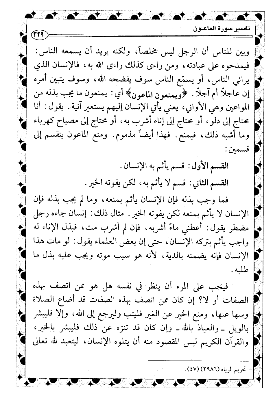 وبين للناس أن الرجل ليس مخلصاً، ولكنه يريد أن يسمعه الناس: فيمدحوه على عبادته، ومن راءى كذلك راءى الله به، فالإنسان الذي يرائي الناس، أو يسمّع الناس سوف يفضحه الله، وسوف يتبين أمره إن عاجلاً أم آجلاً. {ويمنعون الماعون} أي: يمنعون ما يجب بذله من المواعين وهي الأواني، يعني يأتي الإنسان إليهم يستعير آنية. يقول: أنا محتاج إلى دلو، أو محتاج إلى إناء أشرب به، أو محتاج إلى مصباح كهرباء وما أشبه ذلك، فيمنع. فهذا أيضاً مذموم. ومنع الماعون ينقسم إلى قسمين:
