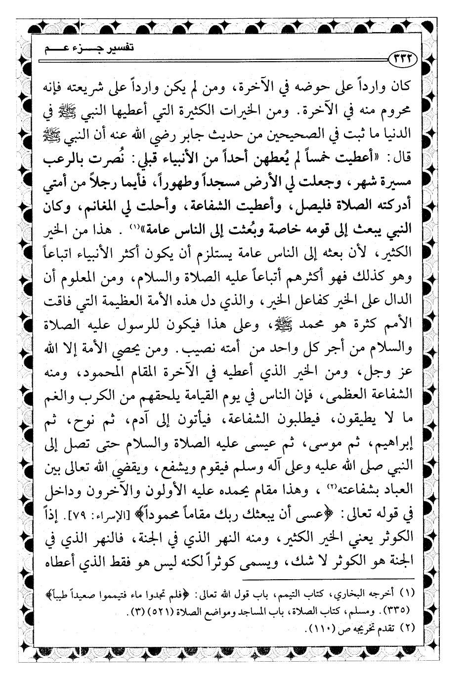 ومن الخيرات الكثيرة التي أعطيها النبي صلى الله عليه وسلّم في الدنيا ما ثبت في الصحيحين من حديث جابر رضي الله عنه أن النبي صلى الله عليه وسلّم قال: «أعطيت خمساً لم يُعطهن أحداً من الأنبياء قبلي: نُصرت بالرعب مسيرة شهر، وجعلت لي الأرض مسجداً وطهوراً، فأيما رجلاً من أمتي أدركته الصلاة فليصل، وأعطيت الشفاعة، وأحلت لي المغانم، وكان النبي يبعث إلى قومه خاصة وبُعثت إلى الناس عامة» (¬1) . هذا من الخير الكثير، لأن بعثه إلى الناس عامة يستلزم أن يكون أكثر الأنبياء اتباعاً وهو كذلك فهو أكثرهم أتباعاً عليه الصلاة والسلام، ومن المعلوم أن الدال على الخير كفاعل الخير، والذي دل هذه الأمة العظيمة التي فاقت الأمم كثرة هو محمد صلى الله عليه وسلّم، وعلى هذا فيكون للرسول عليه الصلاة والسلام من أجر كل واحد من أمته نصيب. ومن يحصي الأمة إلا الله عز وجل، ومن الخير الذي أعطيه في الآخرة المقام المحمود، ومنه الشفاعة العظمى، فإن الناس في يوم القيامة يلحقهم من الكرب والغم ما لا يطيقون، فيطلبون الشفاعة، فيأتون إلى آدم، ثم نوح، ثم إبراهيم، ثم موسى، ثم عيسى عليهم الصلاة والسلام حتى تصل إلى النبي صلى الله عليه وعلى آله وسلم فيقوم ويشفع، ويقضي الله تعالى بين العباد بشفاعته (¬2) ، وهذا مقام يحمده عليه الأولون والآخرون وداخل في قوله تعالى: {عسى أن يبعثك ربك مقاماً محموداً} [الإسراء: 79] .