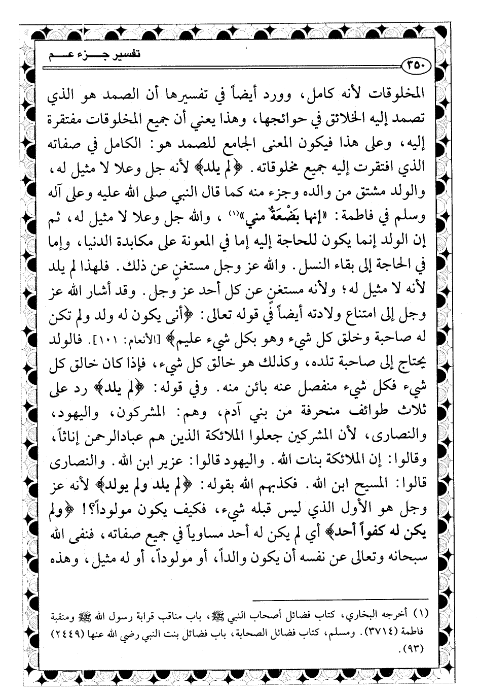وقد أشار الله عز وجل إلى امتناع ولادته أيضاً في قوله تعالى: {أنى يكون له ولد ولم تكن له صاحبة وخلق كل شيء وهو بكل شيء عليم} [الأنعام: 101] . فالولد يحتاج إلى صاحبة تلده، وكذلك هو خالق كل شيء، فإذا كان خالق كل شيء فكل شيء منفصل عنه بائن منه. وفي قوله: {لم يلد} رد على ثلاث طوائف منحرفة من بني آدم، وهم: المشركون، واليهود، والنصارى، لأن المشركين جعلوا الملائكة الذين هم عبادالرحمن إناثاً، وقالوا: إن الملائكة بنات الله. واليهود قالوا: عزير ابن الله. والنصارى قالوا: المسيح ابن الله. فكذبهم الله بقوله: {لم يلد ولم يولد} لأنه عز وجل هو الأول الذي ليس قبله شيء، فكيف يكون مولوداً؟! {ولم يكن له كفواً أحد} أي لم يكن له أحد مساوياً في جميع صفاته، فنفى الله سبحانه وتعالى عن نفسه أن يكون والداً، أو مولوداً، أو له مثيل، وهذه