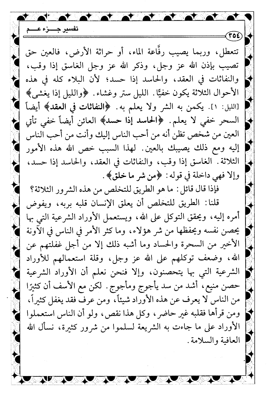تتعطل، وربما يصيب رفَّاعة الماء، أو حراثة الأرض، فالعين حق تصيب بإذن الله عز وجل، وذكر الله عز وجل الغاسق إذا وقب، والنفاثات في العقد، والحاسد إذا حسد؛ لأن البلاء كله في هذه الأحوال الثلاثة يكون خفيًّا. الليل ستر وغشاء. {والليل إذا يغشى} [الليل: 1] . يكمن به الشر ولا يعلم به. {النفاثات في العقد} أيضاً السحر خفي لا يعلم. {الحاسد إذا حسد} العائن أيضاً خفي تأتي العين من شخص تظن أنه من أحب الناس إليك وأنت من أحب الناس إليه ومع ذلك يصيبك بالعين. لهذا السبب خص الله هذه الأمور الثلاثة. الغاسق إذا وقب، والنفاثات في العقد، والحاسد إذا حسد، وإلا فهي داخلة في قوله: {من شر ما خلق} .