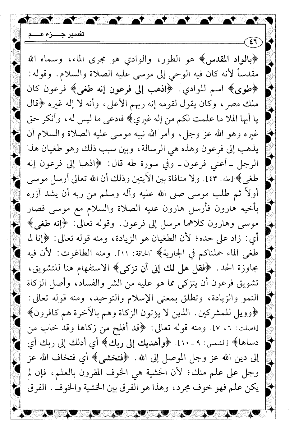 {اذهب إلى فرعون إنه طغى} فرعون كان ملك مصر، وكان يقول لقومه إنه ربهم الأعلى، وأنه لا إله غيره {وقال فرعون يا أيها الملا ما علمت لكم من إله غيري} فادعى ما ليس له، وأنكر حق غيره وهو الله عز وجل، وأمر الله نبيه موسى عليه الصلاة والسلام أن يذهب إلى فرعون وهذه هي الرسالة، وبين سبب ذلك وهو طغيان هذا الرجل ـ أعني فرعون ـ وفي سورة طه قال: {اذهبا إلى فرعون إنه طغى} [طه: 43] . ولا منافاة بين الايتين وذلك أن الله تعالى أرسل موسى أولاً ثم طلب موسى صلى الله عليه وآله وسلم من ربه أن يشد أزره بأخيه هارون فأرسل هارون عليه الصلاة والسلام مع موسى فصار موسى وهارون كلاهما مرسل إلى فرعون. وقوله تعالى: {إنه طغى} أي: زاد على حده؛ لأن الطغيان هو الزيادة، ومنه قوله تعالى: {إنا لما طغى الماء حملناكم في الجارية} [الحاقة: 11] . ومنه الطاغوت: لأن فيه مجاوزة الحد. {فقل هل لك إلى أن تزكى} الاستفهام هنا للتشويق، تشويق فرعون أن يتزكى مما هو عليه من الشر والفساد، وأصل الزكاة النمو والزيادة، وتطلق بمعنى الإسلام والتوحيد، ومنه قوله تعالى: {وويل للمشركين. الذين لا يؤتون الزكاة وهم بالآخرة هم كافرون} [فصلت: 6، 7] . ومنه قوله تعالى: {قد أفلح من زكاها وقد خاب من دساها} [الشمس: 9 ـ 10] . {وأهديك إلى ربك} أي أدلك إلى ربك أي إلى دين الله عز وجل الموصل إلى الله. {فتخشى} أي فتخاف الله عز وجل على علم منك؛ لأن الخشية هي الخوف المقرون بالعلم، فإن لم يكن علم فهو خوف مجرد، وهذا هو الفرق بين الخشية والخوف. الفرق