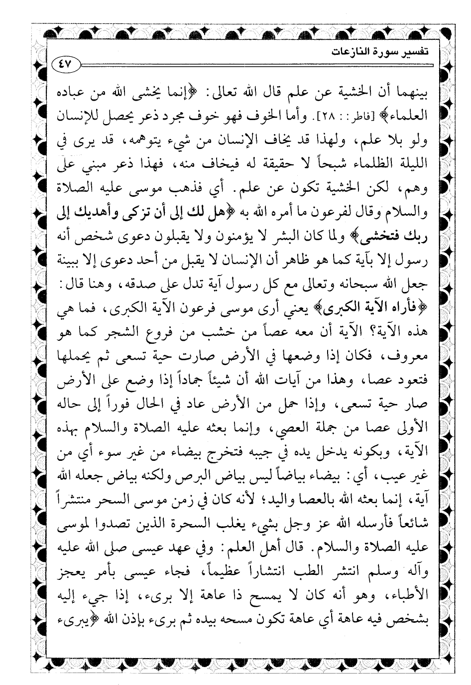 وأما الخوف فهو خوف مجرد ذعر يحصل للإنسان ولو بلا علم، ولهذا قد يخاف الإنسان من شيء يتوهمه لا حقيقة له، قد يرى في الليلة الظلماء شبحاً لا حقيقة له فيخاف منه، فهذا ذعر مبني على وهم، لكن الخشية تكون عن علم. فذهب موسى عليه الصلاة والسلام وقال لفرعون ما أمره الله به {هل لك إلى أن تزكى وأهديك إلى ربك فتخشى} ولما كان البشر لا يؤمنون ولا يقبلون دعوى شخص أنه رسول إلا بآية كما أنه لا يقبل من أحد دعوى إلا ببينة جعل الله سبحانه وتعالى مع كل رسول آية تدل على صدقه، وهنا قال: {فأراه الآية الكبرى} يعني أرى موسى فرعون الآية الكبرى، فما هي هذه الآية؟ الآية أن معه عصاً من خشب من فروع الشجر كما هو معروف، فكان إذا وضعها في الأرض صارت حية تسعى ثم يحملها فتعود عصا، وهذا من آيات الله أن شيئاً جماداً إذا وضع على الأرض صار حية تسعى، وإذا حمل من الأرض عاد في الحال فوراً إلى حاله الأولى عصا من جملة العصي، وإنما بعثه عليه الصلاة والسلام بهذه الآية، وبكونه يدخل يده في جيبه فتخرج بيضاء من غير سوء أي من غير عيب، أي: بيضاء بياضاً ليس بياض البرص ولكنه بياض جعله الله آية، إنما بعثه الله بالعصا واليد؛ لأنه كان في زمن موسى السحر منتشراً شائعاً فأرسله الله عز وجل بشيء يغلب السحرة الذين تصدوا لموسى عليه الصلاة والسلام.