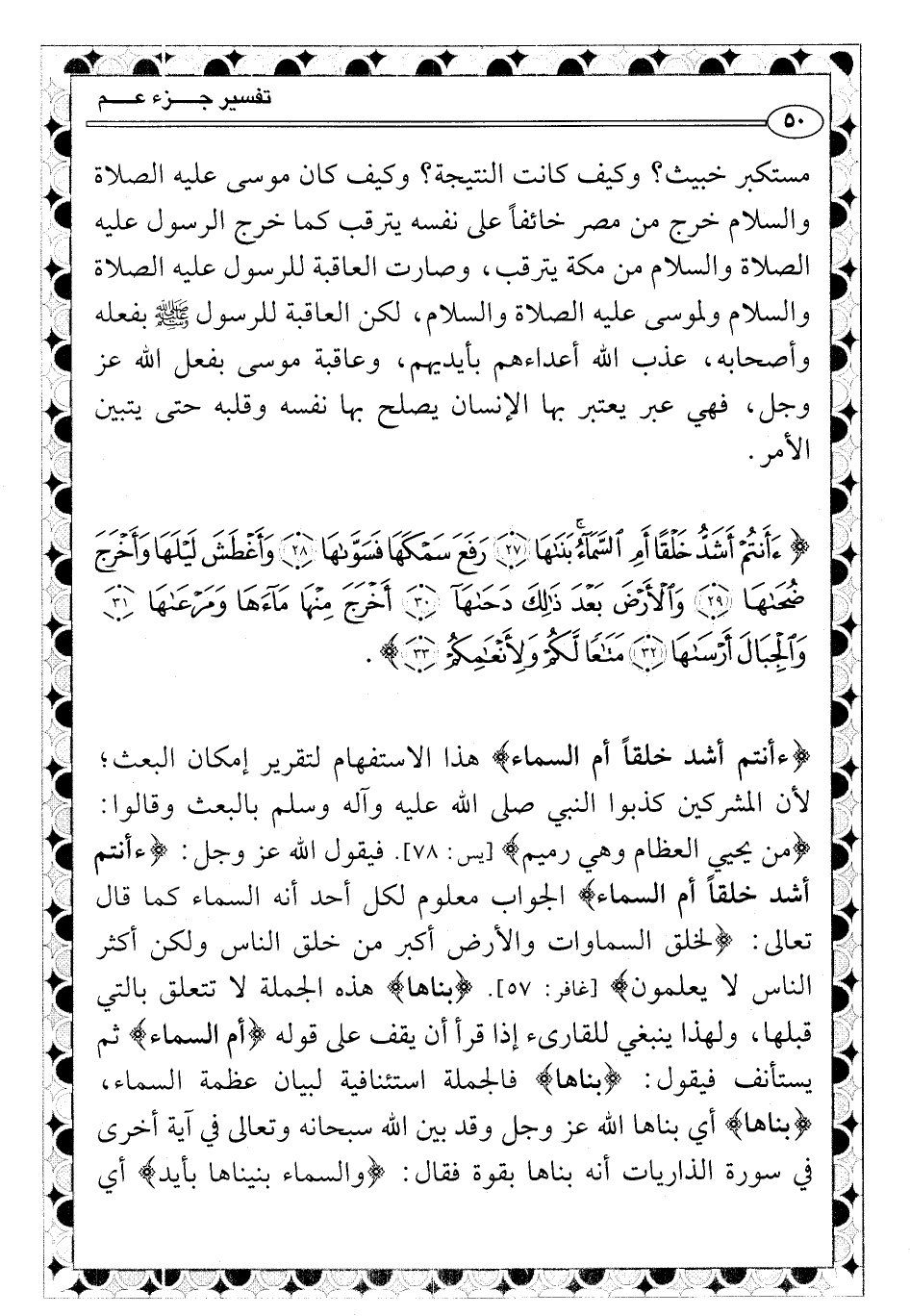 {أَءَنتُمْ أَشَدُّ خَلْقاً أَمِ السَّمَآءُ بَنَهَا * رَفَعَ سَمْكَهَا فَسَوَّاهَا * وَأَغْطَشَ لَيْلَهَا وَأَخْرَجَ ضُحَهَا * وَالاَْرْضَ بَعْدَ ذَلِكَ دَحَهَا * أَخْرَجَ مِنْهَا مَآءَهَا وَمَرْعَهَا * وَالْجِبَالَ أَرْسَهَا * مَتَعاً لَّكُمْ وَلاَِنْعَمِكُمْ} .