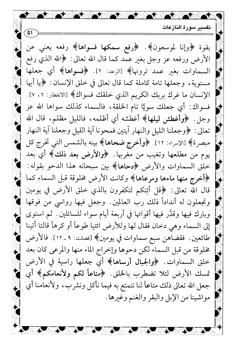 وجعل فيها رواسي من فوقها وبارك فيها وقدَّر فيها أقواتها في أربعة أيام سواء للسائلين. ثم استوى إلى السماء وهي دخان فقال لها وللأرض ائتيا طوعاً أو كرهاً قالتا أتينا طائعين. فقضاهن سبع سماوات في يومين} [فصلت: 9 ـ 12] . فالأرض مخلوقة من قبل السماء لكن دحوها وإخراج الماء والمرعى منها كان بعد خلق السماوات. {والجبال أرساها} أي جعلها راسية في الأرض فلا تنسفها الرياح مهما قويت، وهي أيضاً تمسك الأرض لئلا تضطرب بالخلق كما قال تعالى: {وألقى في الأرض رواسي أن تميد بكم} . {متاعاً لكم ولأنعامكم} أي جعل الله تعالى ذلك متاعاً لنا نتمتع به فيما نأكل ونشرب، ولأنعامنا أي مواشينا من الإبل والبقر والغنم وغيرها. التي تدر علينا وتنمو بها أموالنا.