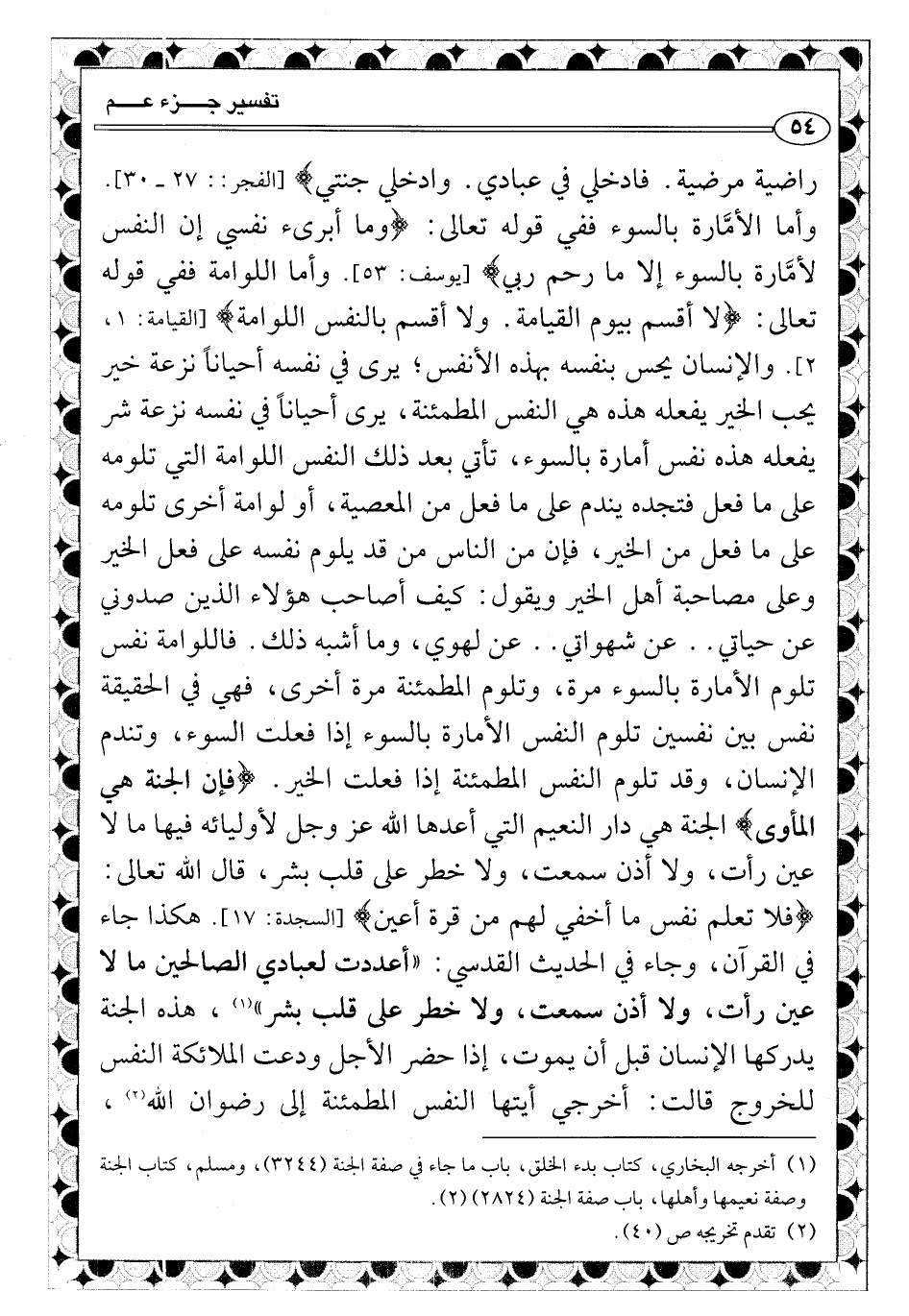 راضية مرضية. فادخلي في عبادي. وادخلي جنتي} [الفجر: 27 ـ 30] . وأما الأمَّارة بالسوء ففي قوله تعالى: {وما أبرىء نفسي إن النفس لأمَّارة بالسوء إلا ما رحم ربي} [يوسف: 53] . وأما اللوامة ففي قوله تعالى: {لا أقسم بيوم القيامة. ولا أقسم بالنفس اللوامة} [القيامة: 1، 2] .
