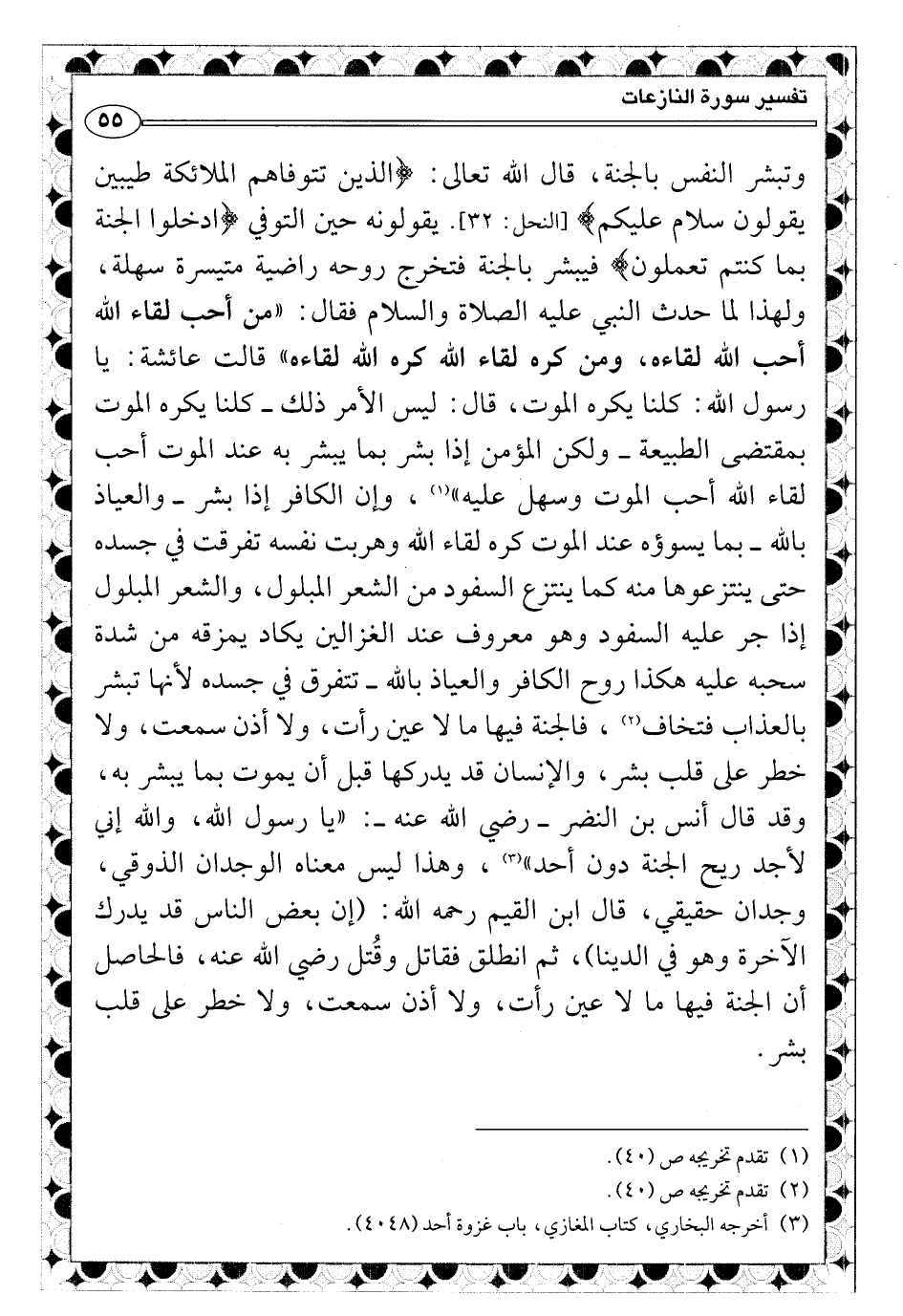 يقولونه حين التوفي {ادخلوا الجنة بما كنتم تعملون} فيبشر بالجنة فتخرج روحه راضية متيسرة سهلة، ولهذا لما حدث النبي عليه الصلاة والسلام فقال: «من أحب لقاء الله أحب الله لقاءه، ومن كره لقاء الله كره الله لقاءه» (¬1) قالت عائشة: يا رسول الله: كلنا يكره الموت، فذكر لها أنه ليس الأمر ذلك ـ ولكن المؤمن إذا بشر بما يبشر به عند الموت أحب لقاء الله أحب الموت وسهل عليه» ، وإن الكافر إذا بشر ـ والعياذ بالله ـ بما يسوؤه عند الموت كره لقاء الله وهربت نفسه وتفرقت في جسده حتى ينتزعوها منه كما ينتزع السفود من الشعر المبلول، والشعر المبلول إذا جر عليه السفود وهو معروف عند الغزالين يكاد يمزقه من شدة سحبه عليه هكذا روح الكافر والعياذ بالله ـ تتفرق في جسده لأنها تبشر بالعذاب فتخاف (¬2) ، فالجنة فيها ما لا عين رأت، ولا أذن سمعت، ولا خطر على قلب بشر، والإنسان قد يدركها قبل أن يموت بما يبشر به، وقد قال أنس بن النضر ـ رضي الله عنه ـ لسعد بن معاذ: «يا سعد، والله إني لأجد ريح الجنة دون أحد» (¬3) ، وهذا ليس معناه الوجدان الذوقي، وجدان حقيقي، قال ابن القيم رحمه الله: (إن بعض الناس قد يدرك الآخرة وهو في الدينا) ، ثم انطلق فقاتل وقُتل رضي الله عنه، فالحاصل أن الجنة فيها ما لا عين رأت، ولا أذن سمعت، ولا خطر على قلب بشر.