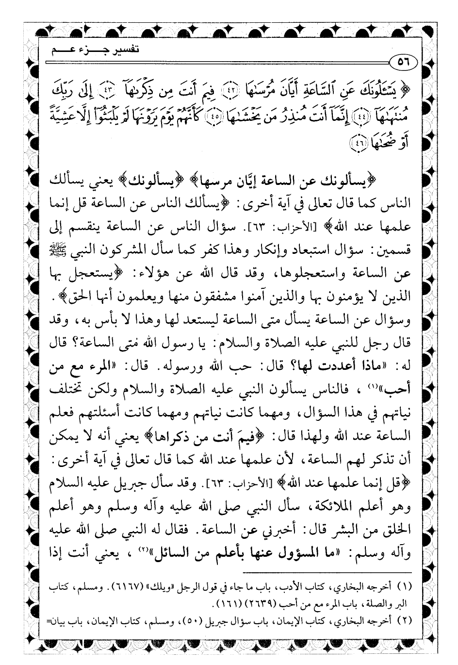 {يسألونك عن الساعة إيَّان مرسها} {يسألونك} يعني يسألك الناس كما قال تعالى في آية أخرى: {يسألك الناس عن الساعة قل إنما علمها عند الله} [الأحزاب: 63] . (مرساها) أي متى وقوعاها سؤال الناس عن الساعة ينقسم إلى قسمين: سؤال استبعاد وإنكار وهذا كفر كما سأل المشركون النبي صلى الله عليه وسلّم عن الساعة واستعجلوها، وقد قال الله عن هؤلاء: {يستعجل بها الذين لا يؤمنون بها والذين آمنوا مشفقون منها ويعلمون أنها الحق} . وسؤال عن الساعة يسأل متى الساعة ليستعد لها وهذا لا بأس به، وقد قال رجل للنبي عليه الصلاة والسلام: يا رسول الله متى الساعة؟ قال له: «ماذا أعددت لها؟ قال: حب الله ورسوله. قال: «المرء مع من أحب» (¬1) ، فالناس يسألون النبي عليه الصلاة والسلام ولكن تختلف نياتهم في هذا السؤال، ومهما كانت نياتهم ومهما كانت أسئلتهم فعلم الساعة عند الله ولهذا قال: {فيمَ أنت من ذكراها} يعني أنه لا يمكن أن تذكر لهم الساعة، لأن علمها عند الله كما قال تعالى في آية أخرى: {قل إنما علمها عند الله} [الأحزاب: 63] . وقد سأل جبريل عليه السلام وهو أعلم الملائكة، بوحي الله النبي صلى الله عليه وآله وسلم وهو أعلم البشر بذلك قال: أخبرني عن الساعة. فقال له النبي صلى الله عليه وآله وسلم: «ما المسؤول عنها بأعلم من السائل» (¬2) ،