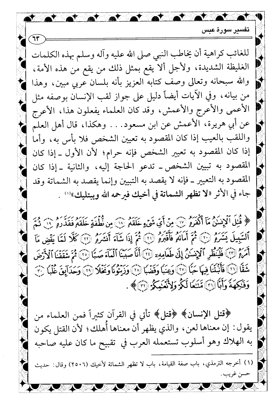 {قُتِلَ الإِنسَنُ مَآ أَكْفَرَهُ * مِنْ أَىِّ شَىْءٍ خَلَقَهُ * مِن نُّطْفَةٍ خَلَقَهُ فَقَدَّرَهُ * ثُمَّ السَّبِيلَ يَسَّرَهُ * ثُمَّ أَمَاتَهُ فَأَقْبَرَهُ * ثُمَّ إِذَا شَآءَ أَنشَرَهُ * كَلاَّ لَمَّا يَقْضِ مَآ أَمَرَهُ * فَلْيَنظُرِ الإِنسَنُ إِلَى طَعَامِهِ * أَنَّا صَبَبْنَا الْمَآءَ صَبّاً * ثُمَّ شَقَقْنَا الاَْرْضَ شَقّاً * فَأَنبَتْنَا فِيهَا حَبّاً * وَعِنَباً وَقَضْباً * وَزَيْتُوناً وَنَخْلاً * وَحَدَآئِقَ غُلْباً * وَفَكِهَةً وَأَبّاً * مَّتَعاً لَّكُمْ وَلاَِنْعَمِكُمْ} .
