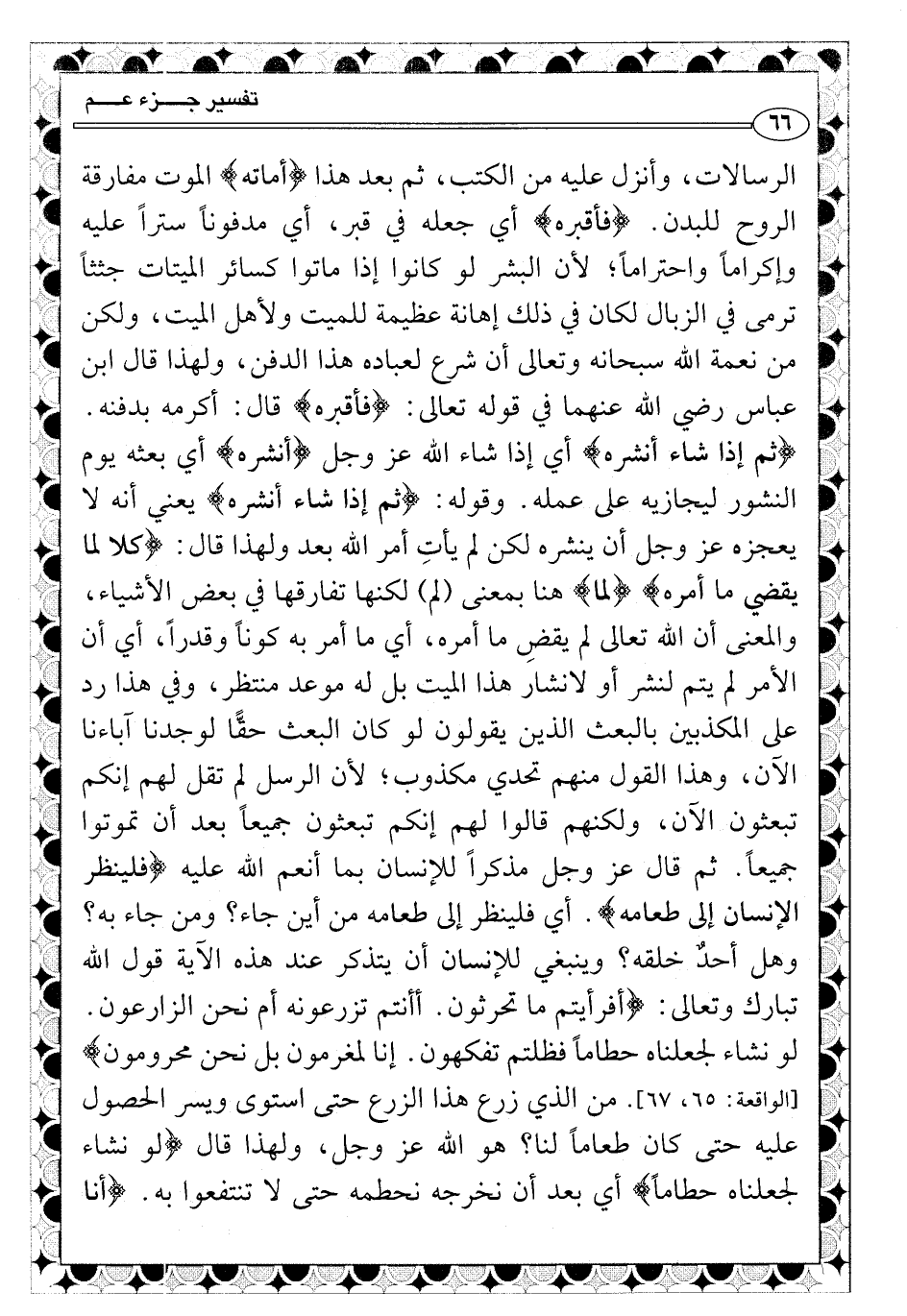 الرسالات، وأنزل عليه من الكتب، ثم بعد هذا {أماته} الموت مفارقة الروح للبدن. {فأقبره} أي جعله في قبر، أي مدفوناً ستراً عليه وإكراماً واحتراماً؛ لأن البشر لو كانوا إذا ماتوا كسائر الميتات جثثاً ترمى في الزبال لكان في ذلك إهانة عظيمة للميت ولأهل الميت، ولكن من نعمة الله سبحانه وتعالى أن شرع لعباده هذا الدفن، ولهذا قال ابن عباس رضي الله عنهما في قوله تعالى: {فأقبره} قال: أكرمه بدفنه. {ثم إذا شاء أنشره} أي إذا شاء الله عز وجل {أنشره} أي بعثه يوم النشور ليجازيه على عمله. وقوله: {ثم إذا شاء أنشره} يعني أنه لا يعجزه عز وجل أن ينشره لكن لم يأتِ أمر الله بعد ولهذا قال: {كلا لما يقض ما أمره} {لما} هنا بمعنى (لم) لكنها تفارقها في بعض الأشياء، والمعنى أن الله تعالى لم يقضِ ما أمره، أي ما أمر به كوناً وقدراً، أي أن الأمر لم يتم لنشر أو لانشار هذا الميت بل له موعد منتظر، وفي هذا رد على المكذبين بالبعث الذين يقولون لو كان البعث حقًّا لوجدنا آباءنا الآن، وهذا القول منهم تحدٍ مكذوب؛ لأن الرسل لم تقل لهم إنكم تبعثون الان، ولكنهم قالوا لهم إنكم تبعثون جميعاً بعد أن تموتوا جميعاً. ثم قال عز وجل مذكراً للإنسان بما أنعم الله عليه {فلينظر الإنسان إلى طعامه} . أي فلينظر إلى طعامه من أين جاء؟ ومن جاء به؟ وهل أحدٌ خلقه سوى الله عز وجل؟ وينبغي للإنسان أن يتذكر عند هذه الآية قول الله تبارك وتعالى: {أفرأيتم ما تحرثون. أأنتم تزرعونه أم نحن الزارعون. لو نشاء لجعلناه حطاماً فظلتم تفكهون. إنا لمغرمون بل نحن محرومون} [الواقعة: 63، 67] .