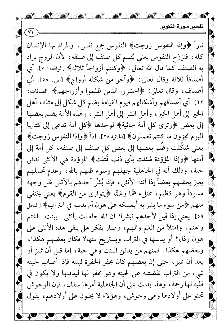 إذاً {وإذا النفوس زوجت} يعني شكّلت وضُم بعضها إلى بعض كل صنف إلى صنفه، كل أمة إلى أمتها {وإذا المؤؤدة سُئلت بأي ذنب قُتلت} الموؤدة هي الأنثى تدفن حية، وذلك أنه في الجاهلية لجهلهم وسوء ظنهم بالله، وعدم تحملهم يعيّر بعضهم بعضاً إذا أتته الأنثى، فإذا بُشِّر أحدهم بالأنثى ظل وجهه مسوداً وهو كظيم، ممتلىء هًّما وغمًّا {يتوارى من القوم} يعني يختفي منهم {من سوء ما بشر به أيمسكه على هون أم يدسه في التراب} [النحل 59] . يعني إذا قيل لأحدهم نبشرك أن الله جاء لك بأنثى ـ ببنت ـ اغتم واهتم، وامتلأ من الغم والهم، وصار يفكر هل يبقي هذه الأنثى على هون وذل؟ أو يدسها في التراب ويستريح منها؟ فكان بعضهم هكذا، وبعضهم هكذا. فمنهم من يدفن البنت وهي حية، إما قبل أن تميز أو بعد أن تميز، حتى إن بعضهم كان يحفر الحفرة لبنته فإذا أصاب لحيته شيء من التراب نفضته عن لحيته وهو يحفر لها ليدفنها ولا يكون في قلبه لها رحمة، وهذا يدلك على أن الجاهلية أمرها سفال، فإن الوحوش تحنو على أولادها وهي وحوش، وهؤلاء لا يحنون على أولادهم، يقول