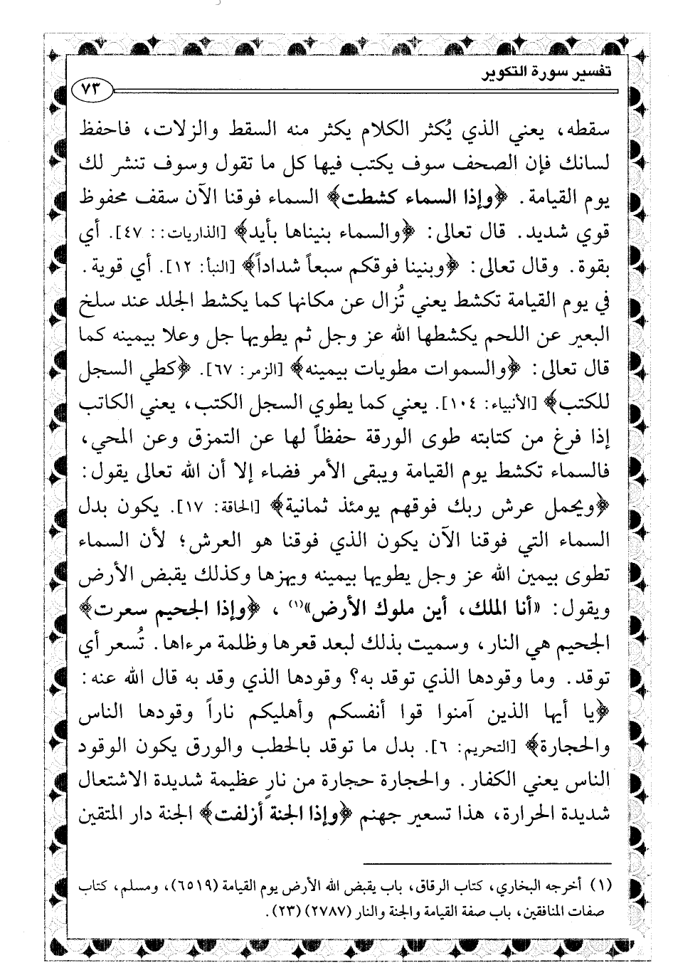 {يوم نطوي السماء كطي السجل للكتب} [الأنبياء: 104] . يعني كما يطوي السجل الكتب، يعني الكاتب إذا فرغ من كتابته طوى الورقة حفظاً لها عن التمزق وعن المحي، فالسماء تكشط يوم القيامة ويبقى الأمر فضاء إلا أن الله تعالى يقول: {ويحمل عرش ربك فوقهم يومئذ ثمانية} [الحاقة: 17] . يكون بدل السماء التي فوقنا الان يكون الذي فوقنا هو العرش؛ لأن السماء تطوى بيمين الله عز وجل يطويها بيمينه ويهزها وكذلك يقبض الأرض (¬1) ويقول: «أنا الملك، أين ملوك الأرض» ، {وإذا الجحيم سعرت} الجحيم هي النار، وسميت بذلك لبعد قعرها وظلمة مرءاها. تُسعر أي توقد. وما وقودها الذي توقد به؟ وقودها الذي توقد به قال الله عنه: {يا أيها الذين آمنوا قوا أنفسكم وأهليكم ناراً وقودها الناس والحجارة} [التحريم: 6] . بدل ما توقد بالحطب يكون الوقود الناس يعني الكفار. والحجارة حجارة من نارٍ عظيمة شديدة الاشتعال شديدة الحرارة، هذا تسعير جهنم {وإذا الجنة} الجنة دار المتقين