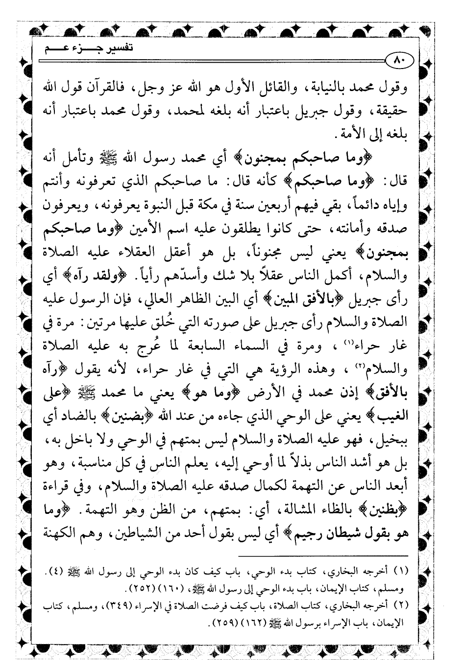 {وما صاحبكم بمجنون} أي محمد رسول الله صلى الله عليه وسلّم وتأمل أنه قال: {وما صاحبكم} فأضافه إليهم ليكون أشد لوماً وتوبيخاً لهم حين ردوا دعوته كأنه قال: ما صاحبكم الذي تعرفونه وأنتم وإياه دائماً، بقي فيهم أربعين سنة في مكة قبل النبوة يعرفونه، ويعرفون صدقه وأمانته، حتى كانوا يطلقون عليه اسم الأمين {وما صاحبكم بمجنون} يعني ليس مجنوناً، بل هو أعقل العقلاء عليه الصلاة والسلام، أكمل الناس عقلاً بلا شك وأسدّهم رأياً. {ولقد رآه} أي رأى محمد جبريل {بالأفق المبين} الأفق جابن السماء والمبين أي البين الظاهر العالي، فإن الرسول عليه الصلاة والسلام رأى جبريل على صورته التي خُلق عليها مرتين: مرة في غار حراء (¬1) ، ومرة في السماء السابعة لما عُرج به عليه الصلاة والسلام (¬2) ، وهذه الرؤية هي التي في غار حراء، لأنه يقول {رآه بالأفق} إذن محمد في الأرض {وما هو} يعني ما محمد صلى الله عليه وسلّم {على الغيب} يعني على الوحي الذي جاءه من عند الله {بضنين} بالضاد أي ببخيل، فهو عليه الصلاة والسلام ليس بمتهم في الوحي ولا باخل به، بل هو أشد الناس بذلاً لما أوحي إليه، يعلم الناس في كل مناسبة، وهو أبعد الناس عن التهمة لكمال صدقه عليه الصلاة والسلام، وفي قراءة {بظنين} بالظاء المشالة، أي: بمتهم، من الظن وهو التهمة.