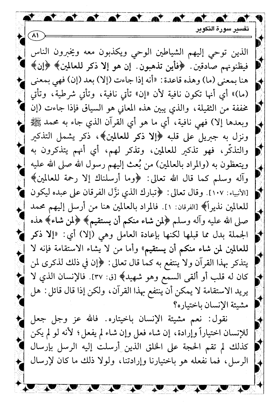 الذين توحي إليهم الشياطين الوحي ويكذبون معه ويخبرون الناس فيظنونهم صادقين. {فأين تذهبون. إن هو إلا ذكر للعالمين} {إن} هنا بمعنى (ما) وهذه قاعدة: «أنه إذا جاءت (إلا) بعد (إن) فهي بمعنى (ما) » أي أنها تكون نافية لأن «إن» تأتي نافية، وتأتي شرطية، وتأتي مخففة من الثقيلة، والذي يبين هذه المعاني هو السياق فإذا جاءت (إن وبعدها إلا) فهي نافية، أي ما هو أي القرآن الذي جاء به محمد صلى الله عليه وسلّم ونزل به جبريل على قلبه {إلا ذكر للعالمين} ، ذكر يشمل التذكير والتذكّر، فهو تذكير للعالمين، وتذكر لهم، أي أنهم يتذكرون به ويتعظون به (والمراد بالعالمين) من بُعث إليهم رسول الله صلى الله عليه وآله وسلم كما قال الله تعالى: {وما أرسلناك إلا رحمة للعالمين} [الأنبياء: 107] . وقال تعالى: {تبارك الذي نزَّل الفرقان على عبده ليكون للعالمين نذيراً} [الفرقان: 1] . فالمراد بالعالمين هنا من أرسل إليهم محمد صلى الله عليه وآله وسلم {لمن شاء منكم أن يستقيم} {لمن شاء} هذه الجملة بدل مما قبلها لكنها بإعادة العامل وهو (إلا) كانه قال: «إن هو إلا ذكر لمن شاء منكم أن يستقيم» فخص بعد التعميم وأما من لا يشاء الاستقامة فإنه لا يتذكر بهذا القرآن ولا ينتفع به كما قال تعالى: {إن في ذلك لذكرى لمن كان له قلب أو ألقى السمع وهو شهيد} [ق: 37] . فالإنسان الذي لا يريد الاستقامة لا يمكن أن ينتفع بهذا القرآن، ولكن إذا قال قائل: هل مشيئة الإنسان باختياره؟