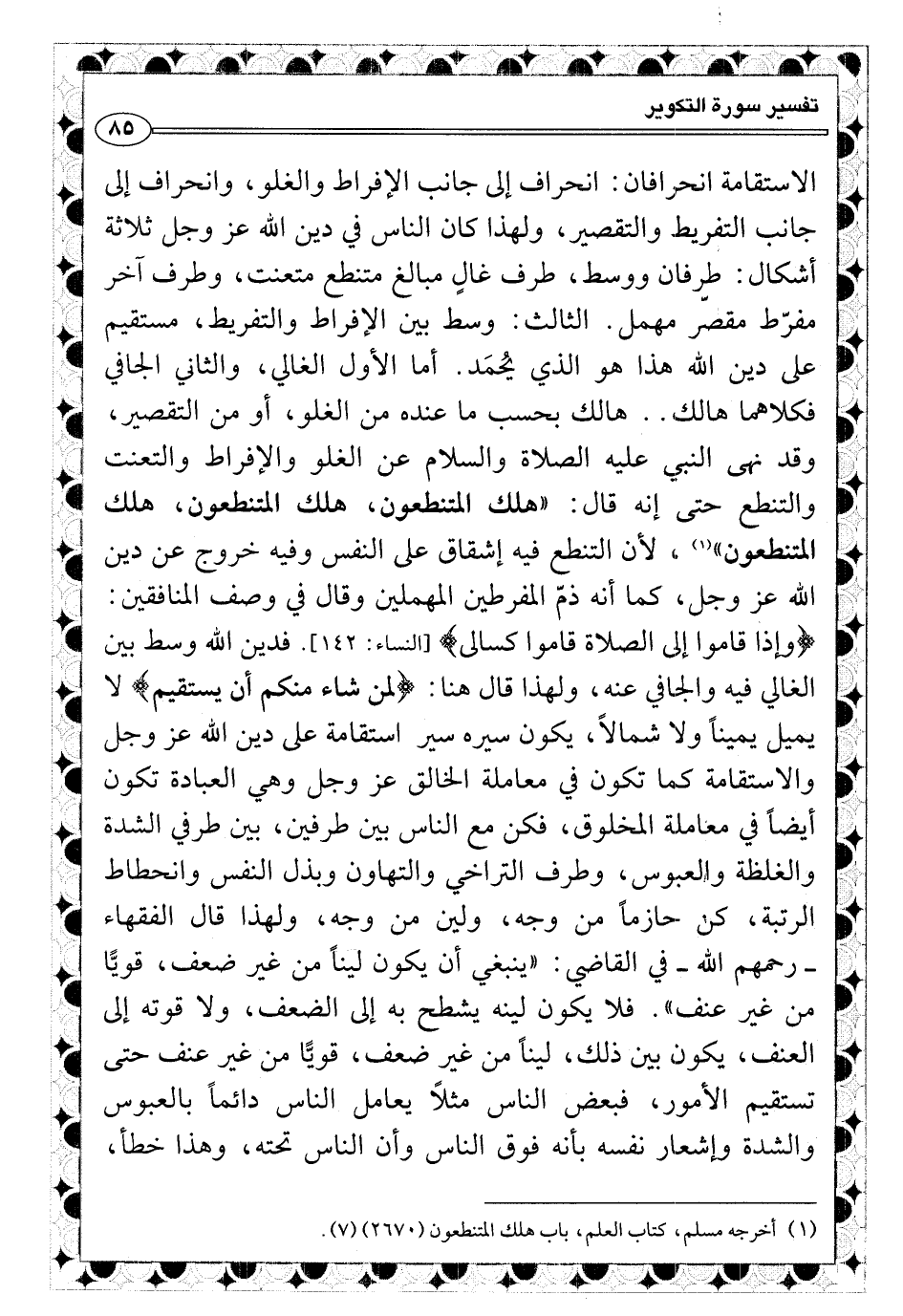 هالك بحسب ما عنده من الغلو، أو من التقصير، وقد نهى النبي عليه الصلاة والسلام عن الغلو والإفراط والتعنت والتنطع حتى إنه قال: «هلك المتنطعون، هلك المتنطعون، هلك المتنطعون» ، لأن التنطع فيه إشقاق على النفس وفيه خروج عن دين الله عز وجل، كما أنه ذمّ المفرطين المهملين وقال في وصف المنافقين: {وإذا قاموا إلى الصلاة قاموا كسالى} [النساء: 142] . فدين الله وسط بين الغالي فيه والجافي عنه، ولهذا قال هنا: {لمن شاء منكم أن يستقيم} لا يميل يميناً ولا شمالاً، يكون سيره سير استقامة على دين الله عز وجل والاستقامة كما تكون في معاملة الخالق عز وجل وهي العبادة تكون أيضاً في معاملة المخلوق، فكن مع الناس بين طرفين، بين طرفي الشدة والغلظة والعبوس، وطرف التراخي والتهاون وبذل النفس وانحطاط الرتبة، كن حازماً من وجه، ولينا من وجه، ولهذا قال الفقهاء ـ رحمهم الله ـ في القاضي: «ينبغي أن يكون ليناً من غير ضعف، قويًّا من غير عنف» . فلا يكون لينه يشطح به إلى الضعف، ولا قوته إلى العنف، يكون بين ذلك، ليناً من غير ضعف، قويًّا من غير عنف حتى تستقيم الأمور، فبعض الناس مثلاً يعامل الناس دائماً بالعبوس والشدة وإشعار نفسه بأنه فوق الناس وأن الناس تحته، وهذا خطأ،