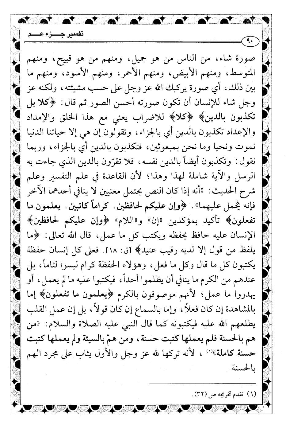 فلا تقرّون بالدين الذي جاءت به الرسل والآية شاملة لهذا وهذا؛ لأن القاعدة في علم التفسير وعلم شرح الحديث: «أنه إذا كان النص يحتمل معنيين لا ينافي أحدهما الآخر فإنه يُحمل عليهما» . {وإن عليكم لحافظين. كراماً كاتبين. يعلمون ما تفعلون} تأكيد بمؤكدين «إن» و «اللام» {وإن عليكم لحافظين} الإنسان عليه حافظ يحفظه ويكتب كل ما عمل، قال الله تعالى: {ما يلفظ من قول إلا لديه رقيب عتيد} [ق: 18] . فعلى كل إنسان حفظة يكتبون كل ما قال وكل ما فعل، وهؤلاء الحفظة كرام ليسوا لئاماً، بل عندهم من الكرم ما ينافي أن يظلموا أحداً، فيكتبوا عليه ما لم يعمل، أو يهدروا ما عمل؛ لأنهم موصوفون بالكرم {يعلمون ما تفعلون} إما بالمشاهدة إن كان فعلاً، وإما بالسماع إن كان قولاً، بل إن عمل القلب يطلعهم الله عليه فيكتبونه كما قال النبي عليه الصلاة والسلام: «من هم بالحسنة فلم يعملها كتبت حسنة، ومن همّ بالسيئة ولم يعملها كتبت حسنة كاملة» (¬1) ، لأنه تركها لله عز وجل والأول يثاب على مجرد الهم بالحسنة.
