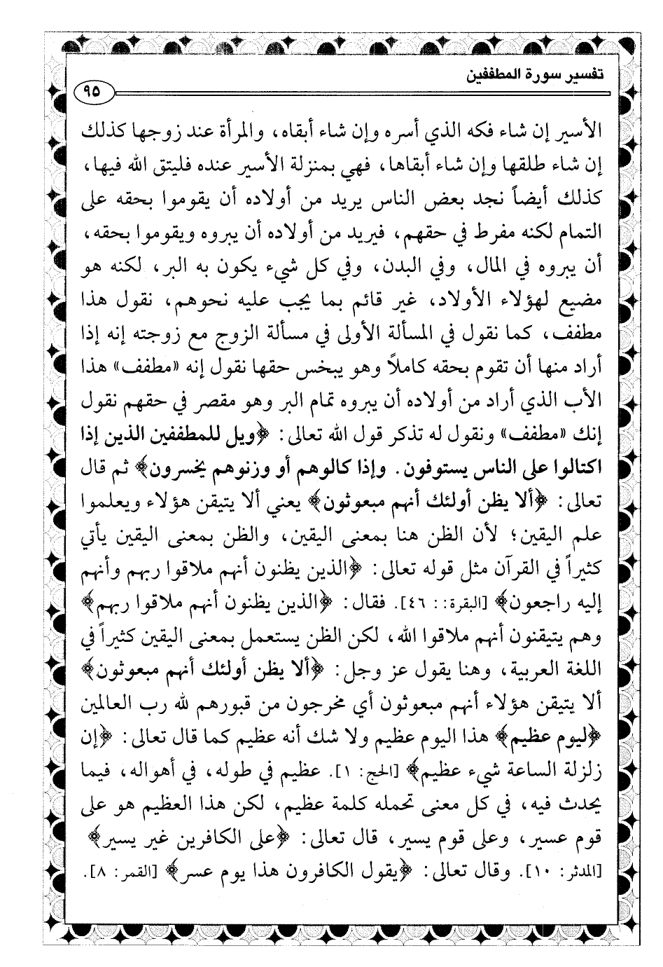 الأسير إن شاء فكه الذي أسره وإن شاء أبقاه، والمرأة عند زوجها كذلك إن شاء طلقها وإن شاء أبقاها، فهي بمنزلة الأسير عنده فليتق الله فيها، كذلك أيضاً نجد بعض الناس يريد من أولاده أن يقوموا بحقه على التمام لكنه مفرط في حقهم، فيريد من أولاده أن يبروه ويقوموا بحقه، أن يبروه في المال، وفي البدن، وفي كل شيء يكون به البر، لكنه هو مضيع لهؤلاء الأولاد، غير قائم بما يجب عليه نحوهم، نقول هذا مطفف، كما نقول في المسألة الأولى في مسألة الزوج مع زوجته إنه إذا أراد منها أن تقوم بحقه كاملاً وهو يبخس حقها نقول إنه «مطفف» هذا الأب الذي أراد من أولاده أن يبروه تمام البر وهو مقصر في حقهم نقول إنك «مطفف» ونقول له تذكر قول الله تعالى: {ويل للمطففين الذين إذا اكتالوا على الناس يستوفون. وإذا كالوهم أو وزنوهم يخسرون} ثم قال تعالى: {ألا يظن أولئك أنهم مبعوثون} يعني ألا يتيقن هؤلاء ويعلموا علم اليقين؛ لأن الظن هنا بمعنى اليقين، والظن بمعنى اليقين يأتي كثيراً في القرآن مثل قوله تعالى: {الذين يظنون أنهم ملاقوا ربهم وأنهم إليه راجعون} [البقرة:: 46] .