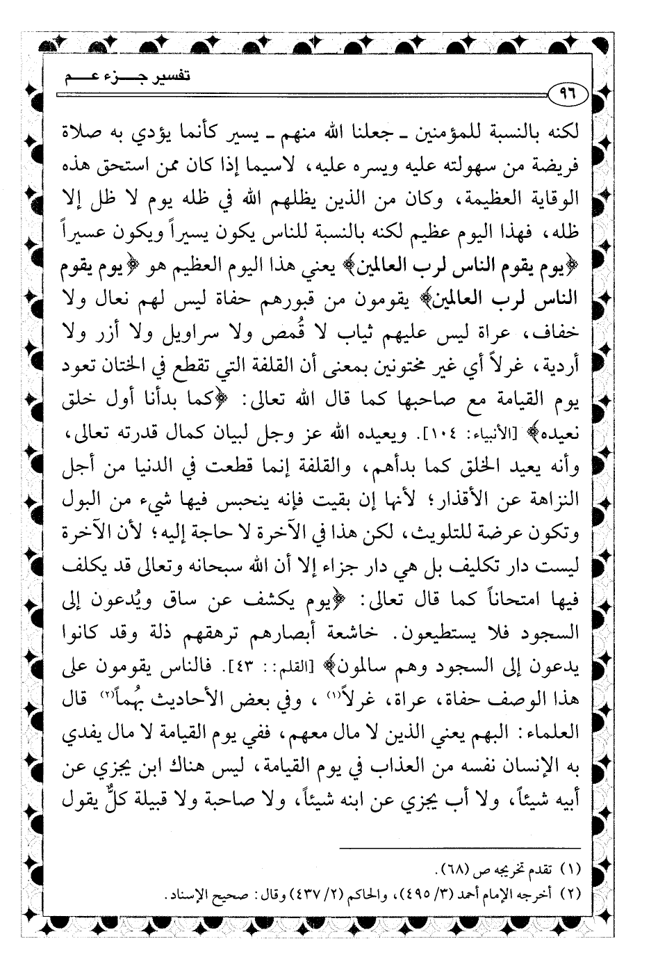 لكنه بالنسبة للمؤمنين ـ جعلنا الله منهم ـ يسير كأنما يؤدي به صلاة فريضة من سهولته عليه ويسره عليه، لاسيما إذا كان ممن استحق هذه الوقاية العظيمة، وكان من الذين يظلهم الله في ظله يوم لا ظل إلا ظله، فهذا اليوم عظيم لكنه بالنسبة للناس يكون يسيراً ويكون عسيراً {يوم يقوم الناس لرب العالمين} قال الله تعالى:) وَكَانَ يَوْماً عَلَى الْكَافِرِينَ عَسِيراً) (الفرقان: من الآية26) يعني هذا اليوم العظيم هو {يوم يقوم الناس لرب العالمين} يقومون من قبورهم حفاة ليس لهم نعال ولا خفاف، عراة ليس عليهم ثياب لا قُمص ولا سراويل ولا أزر ولا أردية، غرلاً أي غير مختونين بمعنى أن القلفة التي تقطع في الختان تعود يوم القيامة مع صاحبها كما قال الله تعالى: {كما بدأنا أول خلق نعيده} [الأنبياء: 104] .