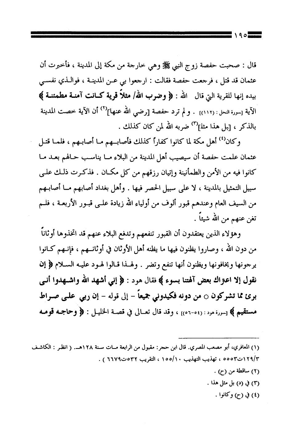 قال: صحبت حفصة زوج النبي صلى الله عليه وسلم وهي خارجة من مكة إلى المدينة، فأخبرت أن عثمان قد قتل، فرجعت حفصة فقالت: ارجعوا بي عن المدينة، فوالذي نفسي بيده إنها للقرية التي قال الله: {وضرب الله / مثلاً قرية كانت آمنة مطمئنة} الآية [سورة النحل: (112)]، ولم ترد حفصة [رضي الله عنها] أن الآية خصت المدينة بالذكر، [بل هذا مثل] ضربه الله لمن كان كذلك.
