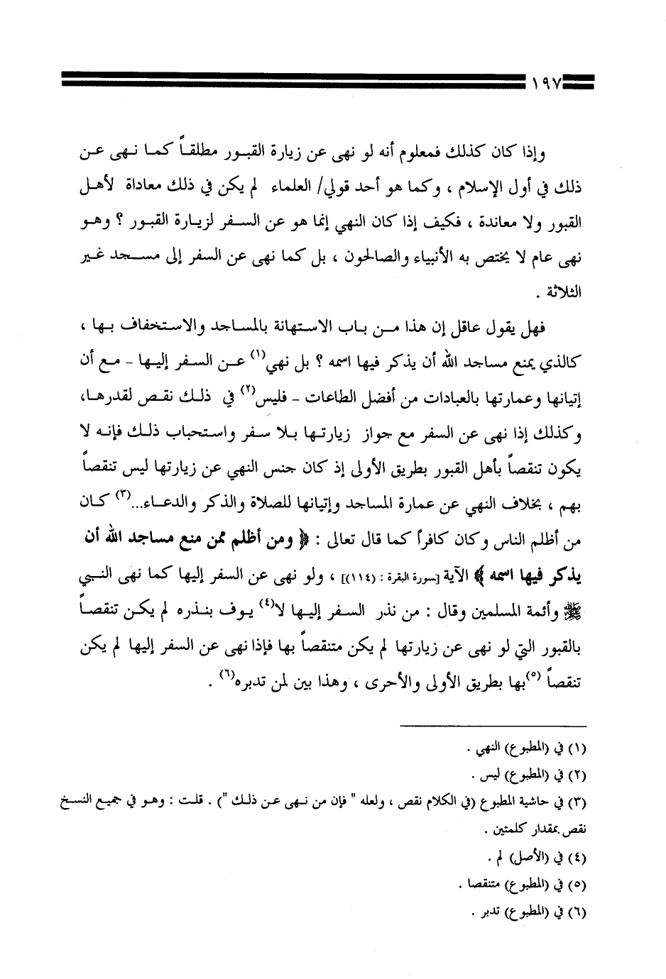 فهل يقول عاقل إن هذا من باب الاستهانة بالمساجد والاستخفاف بها، كالذي يمنع مساجد الله أن يذكر فيها اسمه؟ بل نهي عن السفر إليها -مع أن إتيانها وعمارتها بالعبادات من أفضل الطاعات- فليس في ذلك نقص لقدرها، وكذلك إذا نهى عن السفر مع جواز زيارتها بلا سفر واستحباب ذلك فإنه لا يكون تنقصًا بأهل القبور بطريق الأولى إذ كان جنس النهي عن زيارتها ليس تنقصًا بهم، بخلاف النهي عن عمارة المساجد وإتيانها للصلاة والذكر والدعاء ... كان من أظلم الناس وكان كافرًا كما قال تعالى: {ومن أظلم ممن منع مساجد الله أن يذكر فيها اسمه) الآية [سورة البقرة: (114)]، ولو نهى عن السفر إليها كما نهى النبي صلى الله عليه وسلم وأئمة المسلمين وقال: من نذر السفر إليها لا يوف بنذره لم يكن تنقصًا بالقبور التي لو نهى عن زيارتها لم يكن متنقصًا بها فإذا نهى عن السفر إليها لم يكن تنقصًا بها بطريق الأولى والأحرى، وهذا بين لمن تدبره.