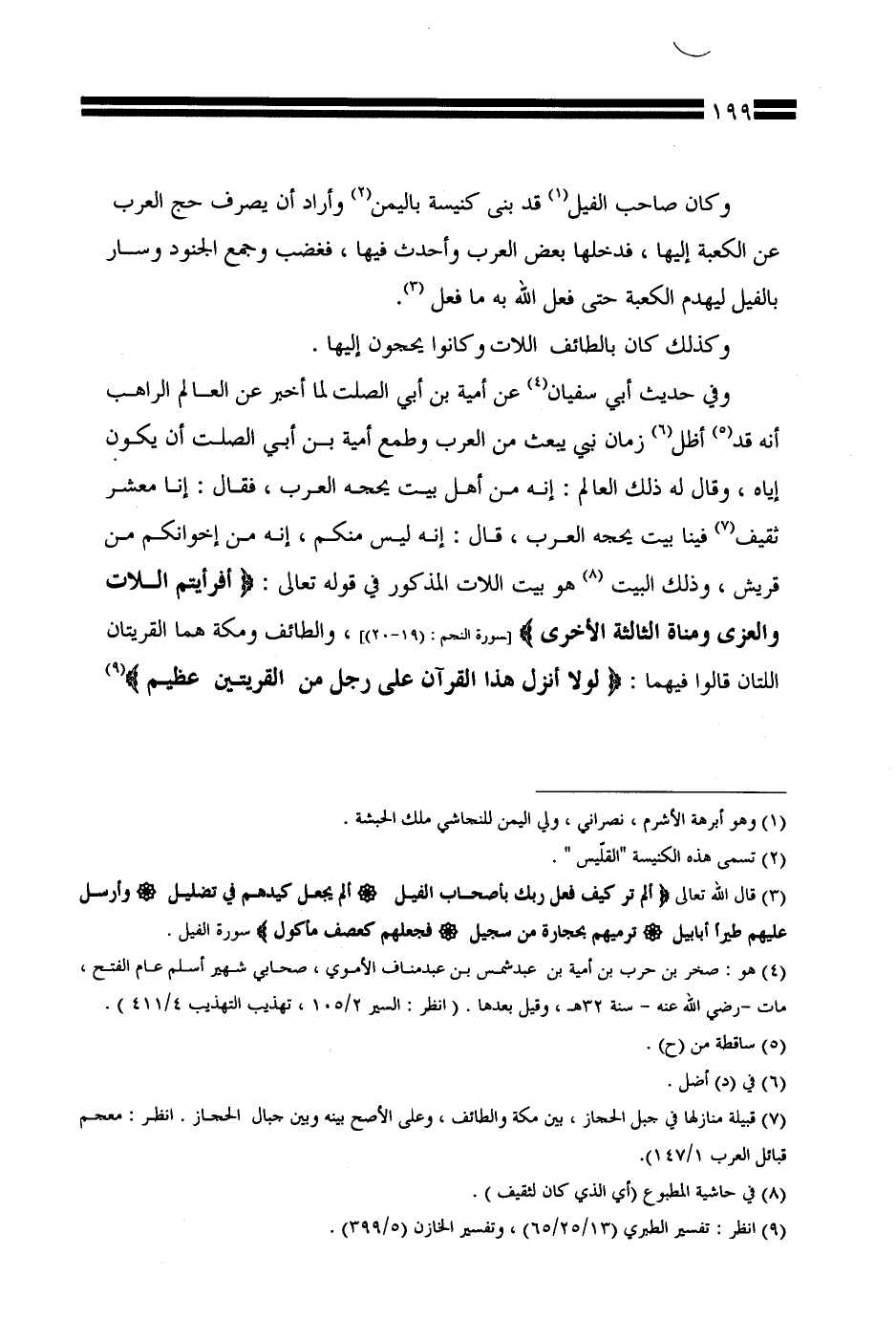 وفي حديث أبي سفيان عن أمية بن أبي الصلت لما أخبر عن العالم الراهب أنه قد أظل زمان نبي يبعث من العرب وطمع أمية بن أبي الصلت أن يكون إياه، وقال له ذلك العالم: إنه من أهل بيت يحجه العرب، فقال: إنا معشر ثقيف فينا بيت يحجه العرب، قال: إنه ليس منكم، إنه من إخوانكم من قريش، وذلك البيت هو بيت اللات المذكور في قوله تعالى: {أفرأيتم اللات والعزى ومناة الثالثة الأخرى} [سورة النجم: (19 - 20)]، والطائف ومكة هما القريتان اللتان قالوا فيهما: {لولا أنزل هذا القرآن على رجل من القريتين عظيم}