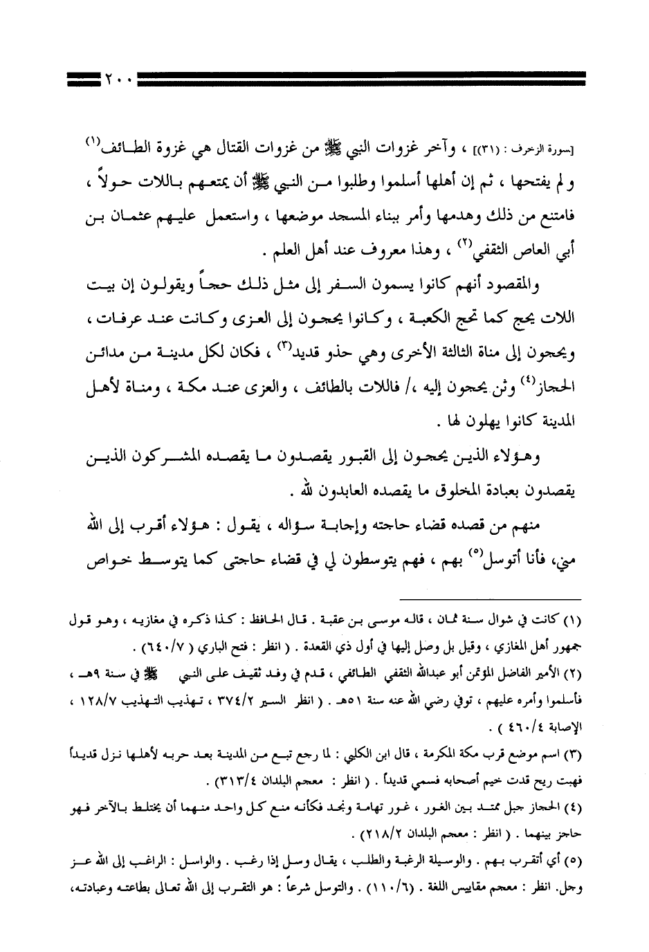 [سورة الزخرف: (31)]، وآخر غزوات النبي صلى الله عليه وسلم من غزوات القتال هي غزوة الطائف ولم يفتحها، ثم إن أهلها أسلموا وطلبوا من النبي صلى الله عليه وسلم أن يمتعهم باللات حولاً، فامتنع من ذلك وهدمها وأمر ببناء المسجد موضعها، واستعمل عليهم عثمان بن أبي العاص الثقفي، وهذا معروف عند أهل العلم.