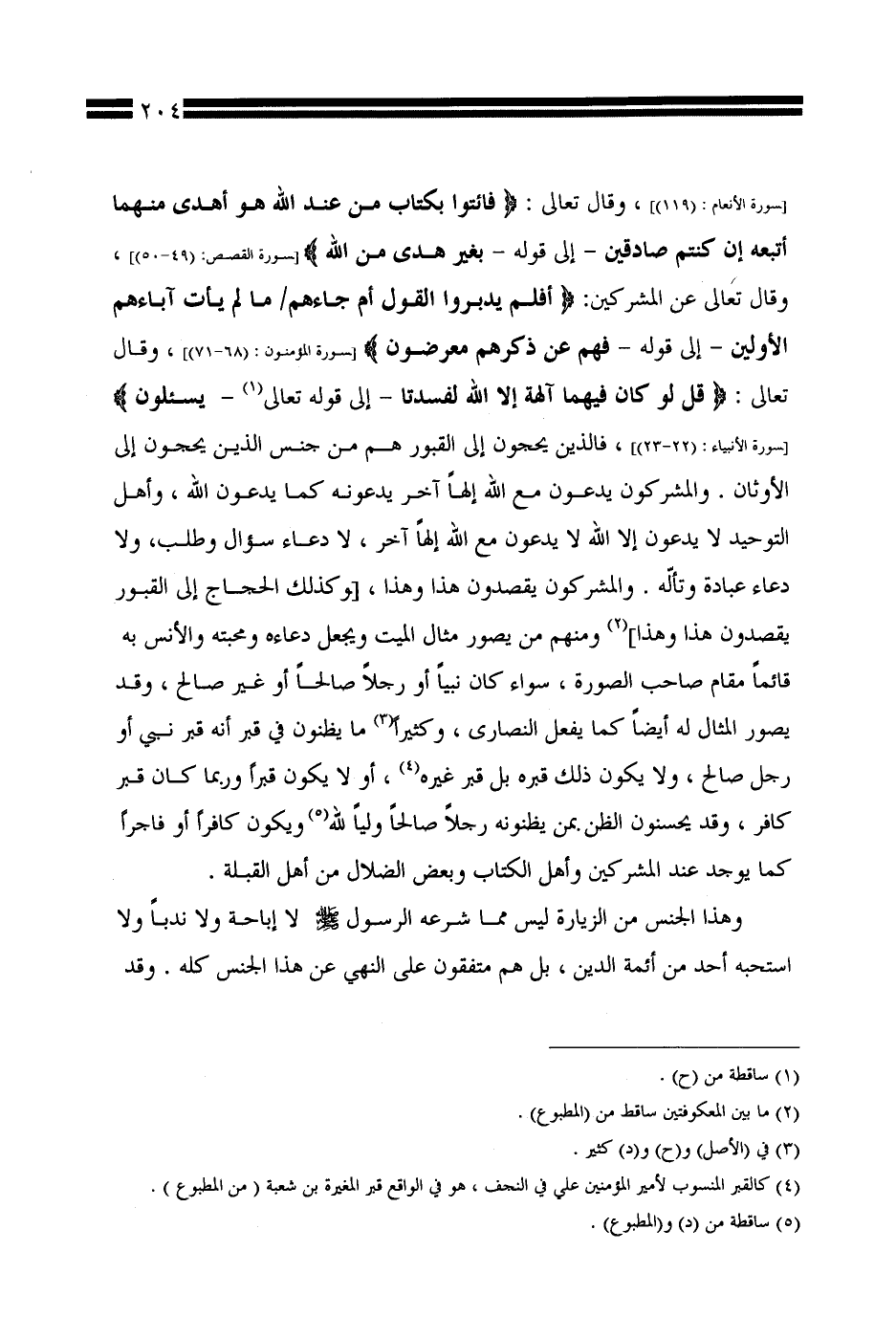 [سورة الأنعام: (119)]، وقال تعالى: {فائتوا بكتاب من عند الله هو أهدى منهما أتبعه إن كنتم صادقين -إلى قوله- بغير هدى من الله} [سورة القصص: (49 - 50)]، وقال تعالى عن المشركين: {أفلم يدبروا القول أم جاءهم / ما لم يأت آباءهم الأولين -إلى قوله- فهم عن ذكرهم معرضون} [سورة المؤمنون: (68 - 71)]، وقال تعالى: {قل لو كان فيهما آلهة إلا الله لفسدتا -إلى قوله تعالى- يسألون} [سورة الأنبياء: (22 - 23)]، فالذين يحجون إلى القبور هم من جنس الذين يحجون إلى الأوثان. والمشركون يدعون مع الله إلهًا آخر يدعونه كما يدعون الله، وأهل التوحيد لا يدعون إلا الله لا يدعون مع الله إلهًا آخر، لا دعاء سؤال وطلب، ولا دعاء عبادة وتألّه. والمشركون يقصدون هذا وهذا، [وكذلك الحجاج إلى القبور يقصدون هذا وهذا] ومنهم من يصور مثال الميت ويجعل دعاءه ومحبته والأنس به قائمًا مقام صاحب الصورة، سواء كان نبيًّا أو رجلاً صالحًا أو غير صالح، وقد يصور المثال له أيضًا كما يفعل النصارى، وكثيرًا ما يظنون في قبر أنه قبر نبي أو رجل صالح، ولا يكون ذلك قبره بل قبر غيره، أو لا يكون قبرًا وربما كان قبر كافر، وقد يحسنون الظن بمن يظنونه رجلاً صالحًا وليًّا لله ويكون كافرًا أو فاجرًا كما يوجد عند المشركين وأهل الكتاب وبعض الضلال من أهل القبلة.