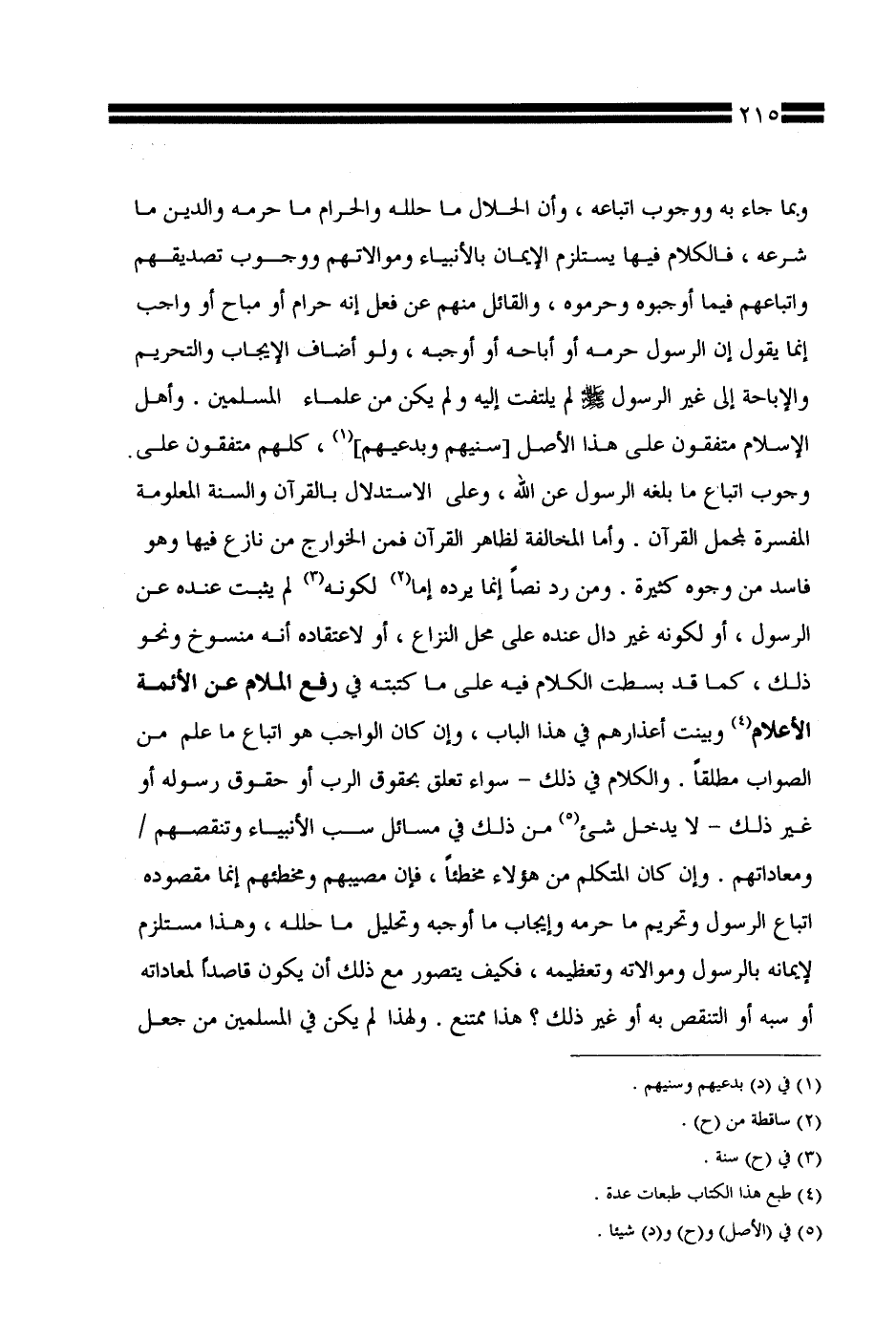 وبما جاء به ووجوب اتباعه، وأن الحلال ما حلله والحرام ما حرمه والدين ما شرعه، فالكلام فيها يستلزم الإيمان بالأنبياء وموالاتهم ووجوب تصديقهم واتباعهم فيما أوجبوه وحرموه، والقائل منهم عن فعل إنه حرام أو مباح أو واجب إنما يقول إن الرسول حرمه أو أباحه أو أوجبه، ولو أضاف الإيجاب والتحريم والإباحة إلى غير الرسول صلى الله عليه وسلم لم يلتفت إليه ولم يكن من علماء المسلمين. وأهل الإسلام متفقون على هذا الأصل [سنيهم وبدعيهم]، كلهم متفقون على وجوب اتباع ما بلغه الرسول عن الله، وعلى الاستدلال بالقرآن والسنة المعلومة المفسرة لمجمل القرآن. وأما المخالفة لظاهر القرآن فمن الخوارج من نازع فيها وهو فاسد من وجوه كثيرة. ومن رد نصًّا إنما يرده إما لكونه لم يثبت عنده عن الرسول، أو لكونه غير دال عنده على محل النزاع، أو لا اعتقاده أنه منسوخ ونحو ذلك، كما قد بسطت الكلام فيه على ما كتبته في رفع الملام عن الأئمة الأعلام وبينت أعذارهم في هذا الباب، وإن كان الواجب هو اتباع ما علم من الصواب مطلقًا. والكلام في ذلك -سواء تعلق بحقوق الرب أو حقوق رسوله أو غير ذلك- لا يدخل شيء من ذلك في مسائل سب الأنبياء وتنقصهم / ومعاداتهم. وإن كان المتكلم من هؤلاء مخطئًا، فإن مصيبهم ومخطئهم إنما مقصوده اتباع الرسول وتحريم ما حرمه وإيجاب ما أوجبه وتحليل ماحلله، وهذا مستلزم لإيمانه بالرسول وموالاته وتعظيمه، فكيف يتصور مع ذلك أن يكون قاصدًا لمعاداته أو سبه أوالتنقص به أو غير ذلك؟ هذا ممتنع. ولهذا لم يكن في المسلمين من جعل