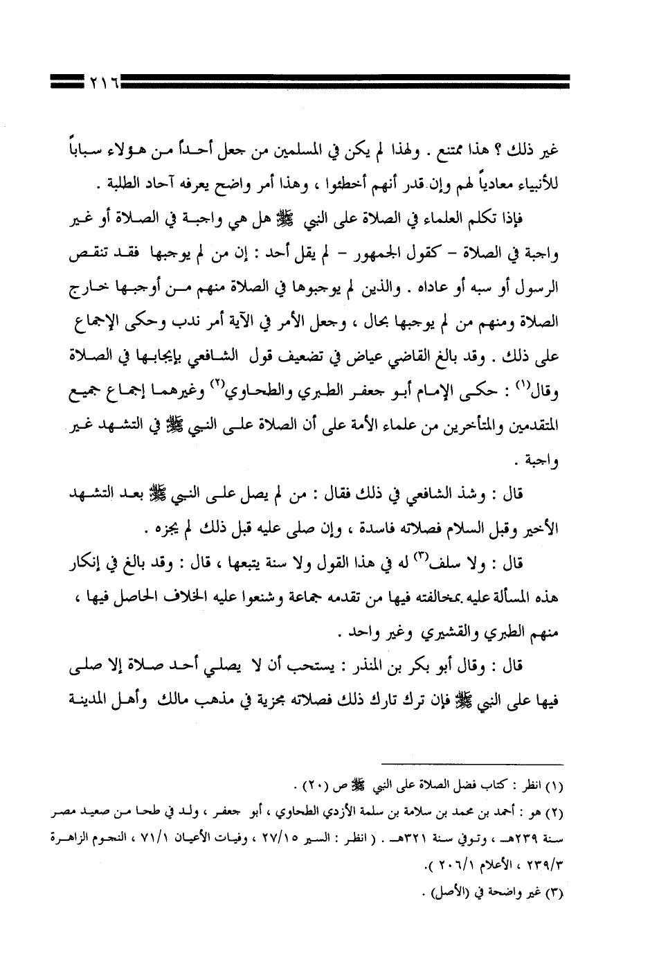فإذا تكلم العلماء في الصلاة على النبي صلى الله عليه وسلم هل هي واجبة في الصلاة أو غير واجبة في الصلاة -كقول الجمهور- لم يقل أحد: إن من لم يوجبها فقد تنقص الرسول أو سبه أوعاداه. والذين لم يوجبوها في الصلاة منهم من أوجبها خارج الصلاة ومنهم من لم يوجبها بحال، وجعل الأمر في الآية أمر ندب وحكى الإجماع على ذلك. وقد بالغ القاضي عياض في تضعيف قول الشافعي بإيجابها في الصلاة وقال: حكى الإمام أبو جعفر الطبري والطحاوي وغيرهما إجماع جميع المتقدمين والمتأخرين من علماء الأمة على أن الصلاة على النبي صلى الله عليه وسلم في التشهد غير واجبة.