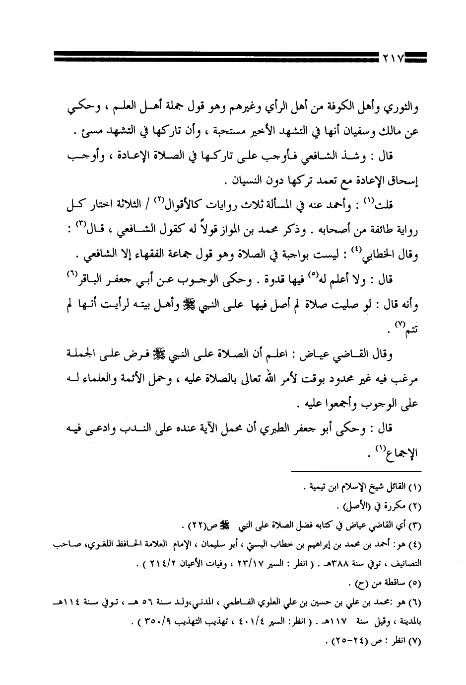 والثوري وأهل الكوفة من أهل الرأي وغيرهم وهو قول جملة أهل العلم، وحكي عن مالك وسفيان أنها في التشهد الأخير مستحبة، وأن تاركها في التشهد مسيء.