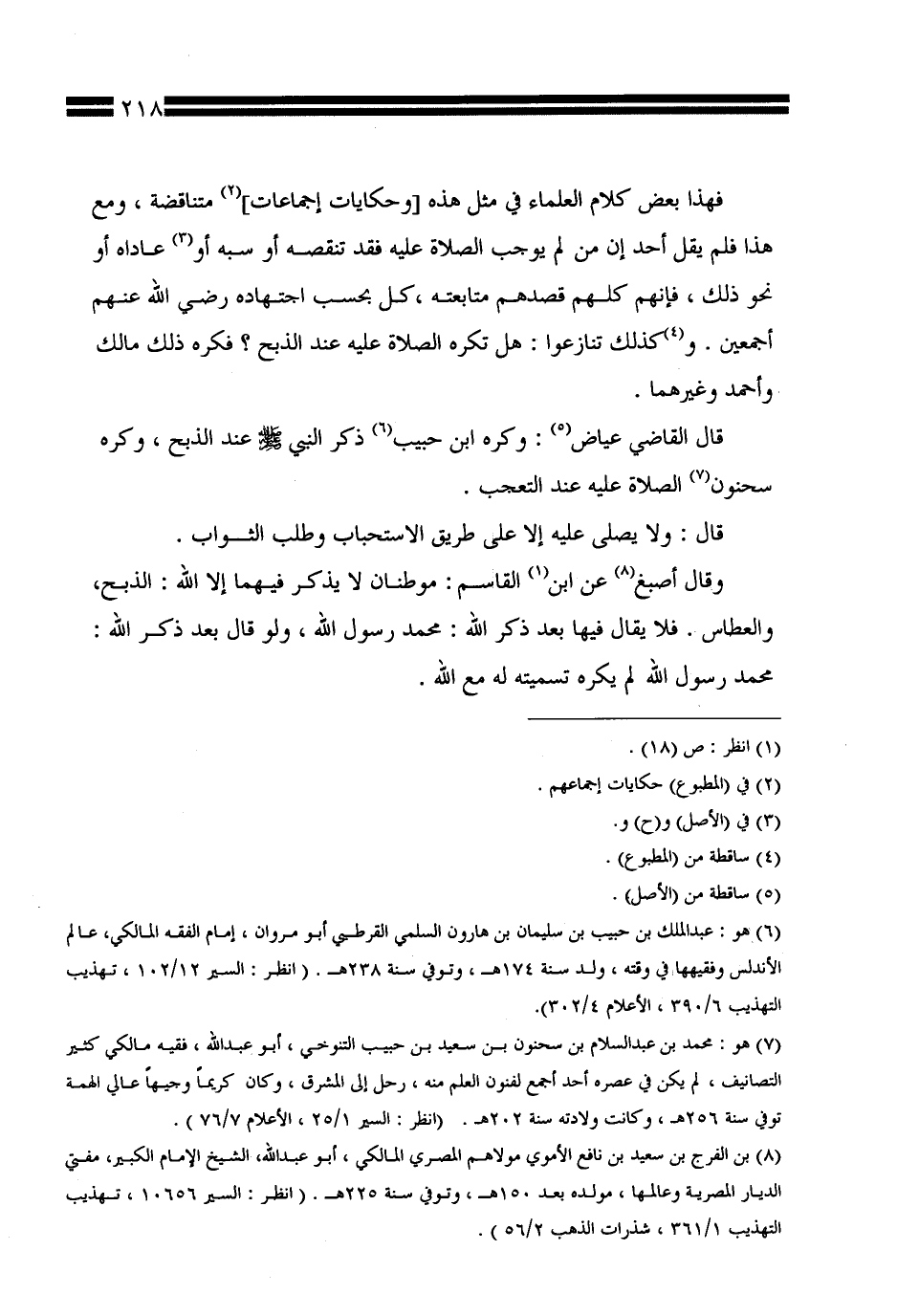 قال القاضي عياض: وكره ابن حبيب ذكر النبي صلى الله عليه وسلم عند الذبح، وكره سحنون الصلاة عليه عند التعجب.