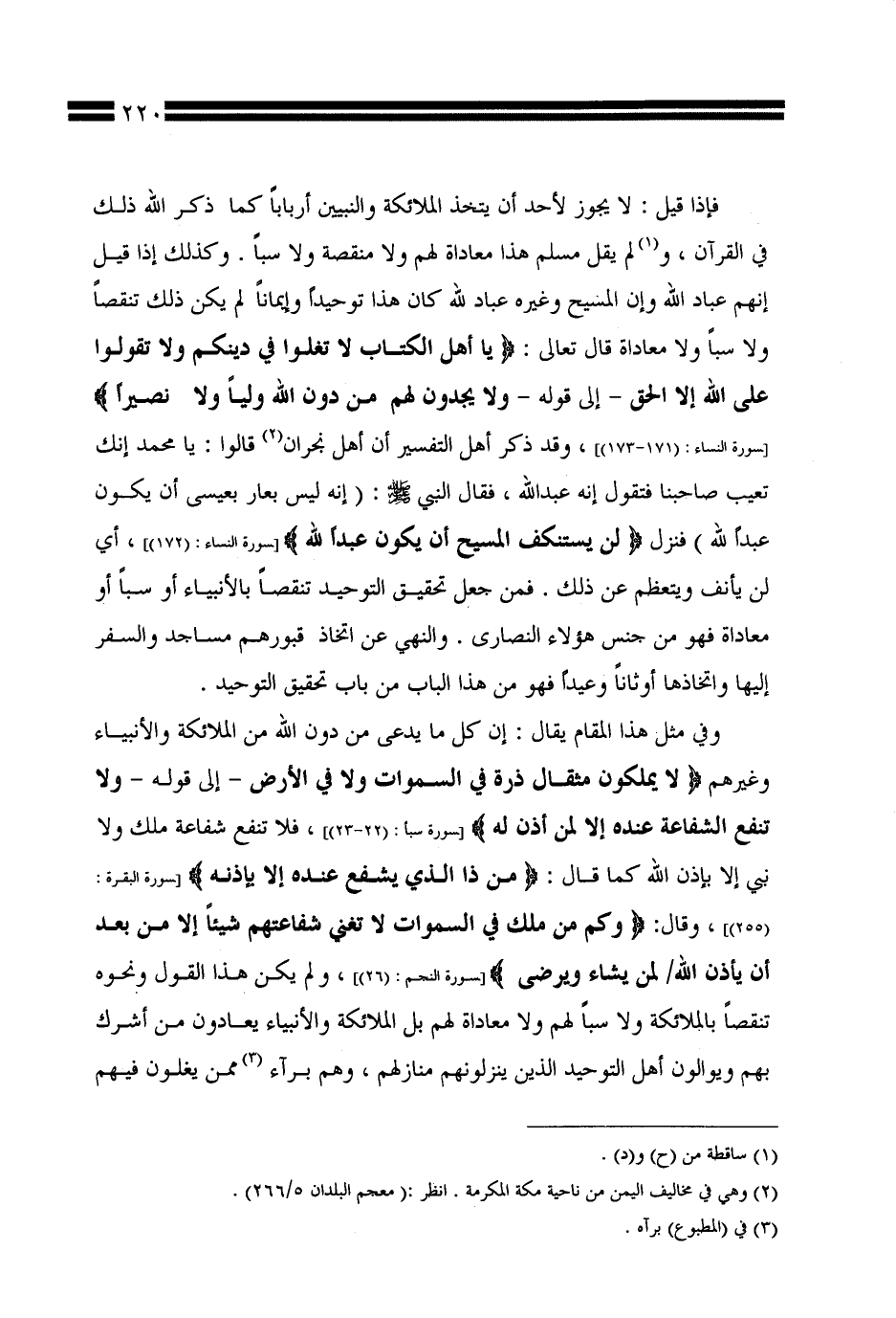 فإذا قيل: لا يجوز لأحد أن يتخذ الملائكة والنبيين أربابًا كما ذكر الله ذلك في القرآن، ولم يقل مسلم هذا معاداة لهم ولا منقصة ولا سبًّا. وكذلك إذا قيل إنهم عباد الله وإن المسيح وغيره عباد لله كان هذا توحيدًا وإيمانًا لم يكن ذلك تنقصًا ولا سبًّا ولا معاداة قال تعالى: {يا أهل الكتاب لا تغلوا في دينكم ولا تقولوا على الله إلا الحق -إلى قوله- ولا يجدون لهم من دون لله وليًّا ولا نصيرًا} [سورة النساء: (171 - 173)]، وقد ذكر أهل التفسير أن أهل نجران قالوا: يا محمد إنك تعيب صاحبنا فتقول إنه عبد الله، فقال النبي صلى الله عليه وسلم: (إنه ليس بعار بعيسى أن يكون عبدًا لله) فنزل {لن يستنكف المسيح أن يكون عبدًا لله} [سورة النساء: (172)]، أي لن يأنف ويتعظم عن ذلك. فمن جعل تحقيق التوحيد تنقصًا بالأنبياء أو سبًّا أو معاداة فهو من جنس هؤلاء النصارى. والنهي عن اتخاذ قبورهم مساجد والسفر إليها واتخاذها أوثانًا وعيدًا فهو من هذا الباب من باب تحقيق التوحيد.