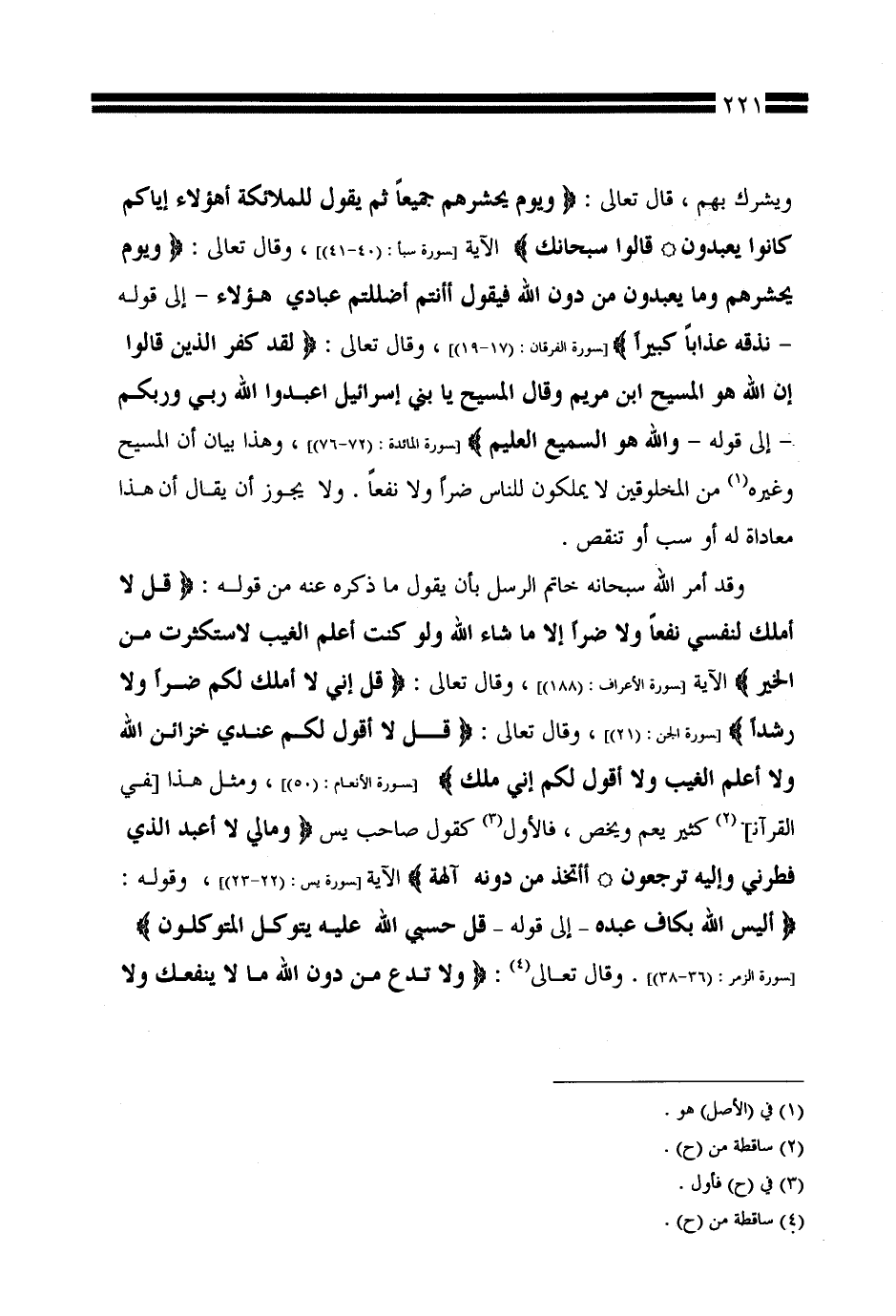 وقد أمر الله سبحانه خاتم الرسل بأن يقول ما ذكره عنه من قوله: {قل لا أملك لنفسي نفعًا ولا ضرًّا إلا ما شاء الله ولو كنت أعلم الغيب لاستكثرت من الخير) الآية [سورة الأعراف: (188)]، وقال تعالى: {قل إني لا أملك لكم ضرًّا ولا رشدًا} [سورة الجن: (21)]، وقال تعالى: {قل لا أقول لكم عندي خزائن الله ولا أعلم الغيب ولا أقول لكم إني ملك} [سورة الأنعام: (50)]، ومثل هذا [في القرآن] كثير يعم ويخص، فالأول كقول صاحب يس {وما لي لا أعبد الذي فطرني وإليه ترجعون * أأتخذ من دونه آلهة} الآية [سورة يس: (22 - 23)]، وقوله: {أليس الله بكاف عبده -إلى قوله- قل حسبي الله عليه يتوكل المتوكلون} [سورة الزمر: (36 - 38)]. وقال تعالى: {ولا تدع من دون الله ما لا ينفعك ولا