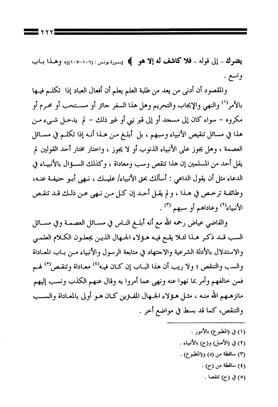 والقاضي عياض رحمه الله مع أنه أبلغ الناس في مسائل العصمة وفي مسائل السب قد ذكر هذا لئلا يقع فيه هؤلاء الجهال الذين يجعلون الكلام العلمي والاستدلال بالأدلة الشرعية والاجتهاد في متابعة الرسول والأنبياء من باب المعاداة والسب والتنقص؛ ولا ريب أن هذا الباب إن كان فيه معاداة وتنقص لهم فمن خالفهم وأمر بما نهوا عنه ونهى عما أمروا به وقال عنهم الكذب ونسب إليهم ما نزههم الله منه، مثل هؤلاء الجهال المفترين كان هو أولى بالمعاداة والسب والتنقص، كما قد بسط في مواضع أخر.
