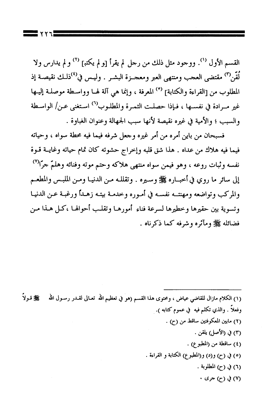 فسبحان من باين أمره من أمر غيره وجعل شرفه فيما فيه محطة سواه، وحياته فيما فيه هلاك من عداه. هذا شق قلبه وإخراج حشوته كان تمام حياته وغاية قوة نفسه وثبات روعه، وهو فيمن سواه منتهى هلاكه وحتم موته وفنائه وهلمّ جرّا إلى سائر ما روي في أخباره صلى الله عليه وسلم وسيره. وتقلله من الدنيا ومن الملبس والمطعم والمركب وتواضعه ومهنته نفسه في أموره وخدمة بيته زهدًا ورغبة عن الدنيا وتسوية بين حقيرها وخطيرها لسرعة فناء أمورها وتقلب أحوالها، كل هذا من فضائله صلى الله عليه وسلم ومآثره وشرفه كما ذكرناه.