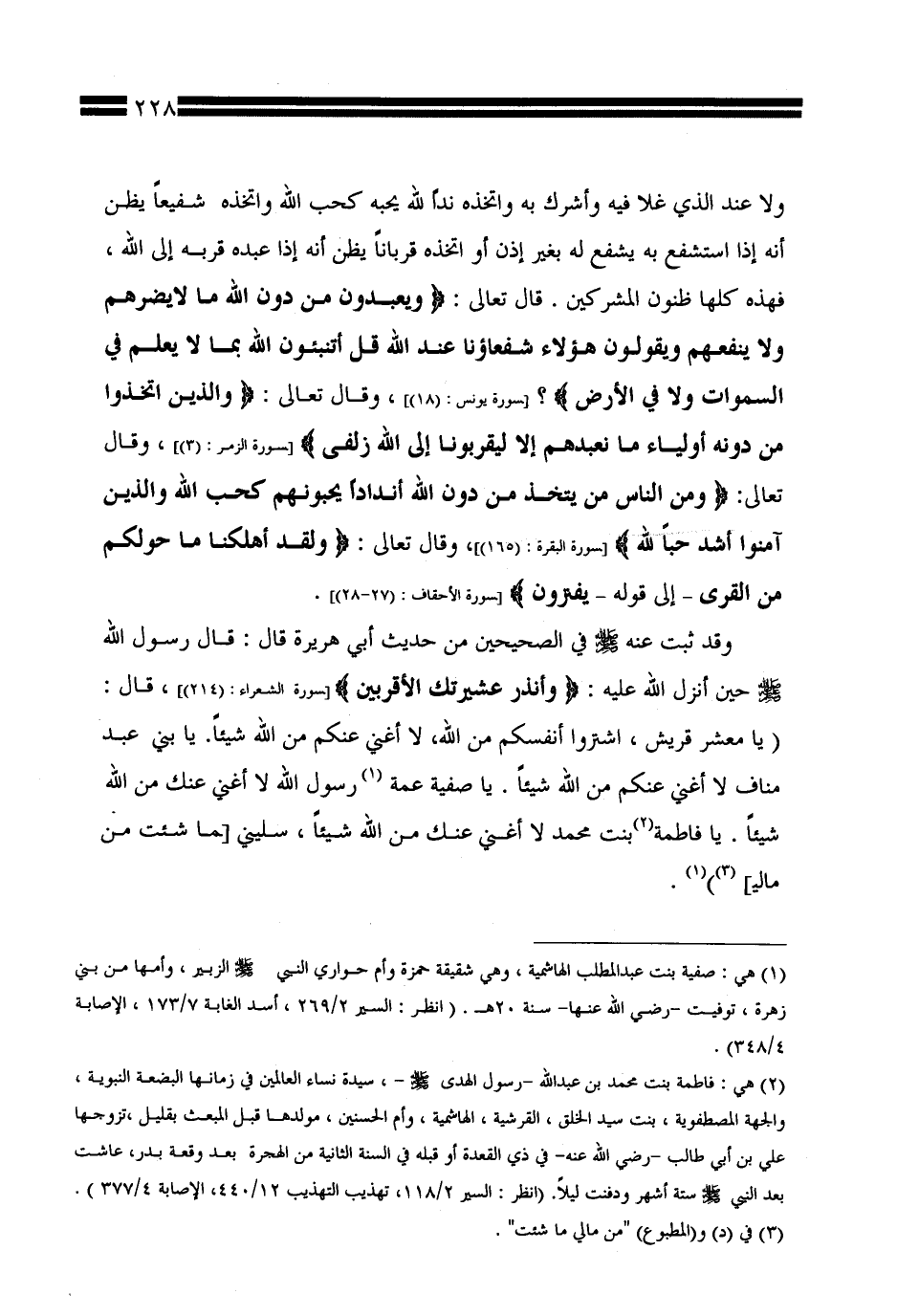 وقد ثبت عنه صلى الله عليه وسلم في الصحيحين من حديث أبي هريرة قال: قال رسول الله صلى الله عليه وسلم حين أنزل الله عليه: {وأنذر عشيرتك الأقربين} [سورة الشعراء: (214)]، قال: (يا معشر قريش، اشتروا أنفسكم من الله، لا أغني عنكم من الله شيئًا. يا بني عبد مناف لا أغني عنكم من الله شيئًا. يا صفية عمة رسول الله لا أغني عنك من الله شيئًا. يا فاطمة بنت محمد لا أغني عنك من الله شيئًا، سليني [ما شئت من مالي]).
