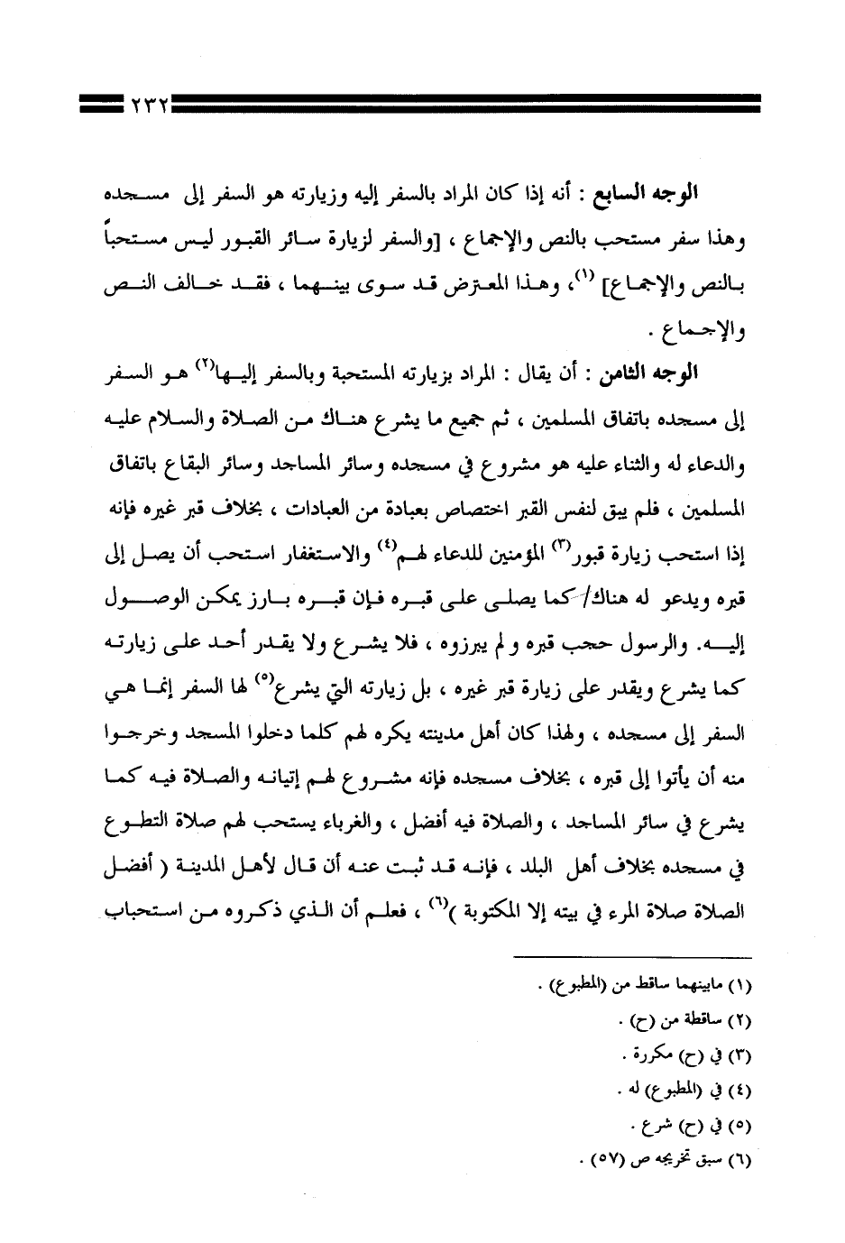 الوجه السابع: أنه إذا كان المراد بالسفر إليه وزيارته هو السفر إلى مسجده وهذا سفر مستحب بالنص والإجماع، [والسفر لزيارة سائر القبور ليس مستحبًّا بالنص والإجماع]، وهذا المعترض قد سوى بينهما، فقد خالف النص والإجماع.