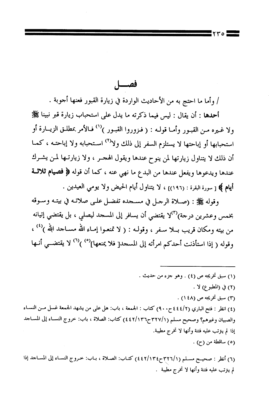 أحدها: أن يقال: ليس فيما ذكرته ما يدل على استحباب زيارة قبر نبينا صلى الله عليه وسلم ولا غيره من القبور وأما قوله: (فزوروا القبور) فالأمر بمطلق الزيارة أو استحبابها أو إباحتها لا يستلزم السفر إلى ذلك ولا استحبابه ولا إباحته، كما أن ذلك لا يتناول زيارتها لمن ينوح عندها ويقول الهجر، ولا زيارتها لمن يشرك عندها ويدعوها ويفعل عندها من البدع ما نهي عنه، كما أن قوله {فصيام ثلاثة أيام} [سورة البقرة: (196)]، لا يتناول أيام الحيض ولا يومي العيدين.
