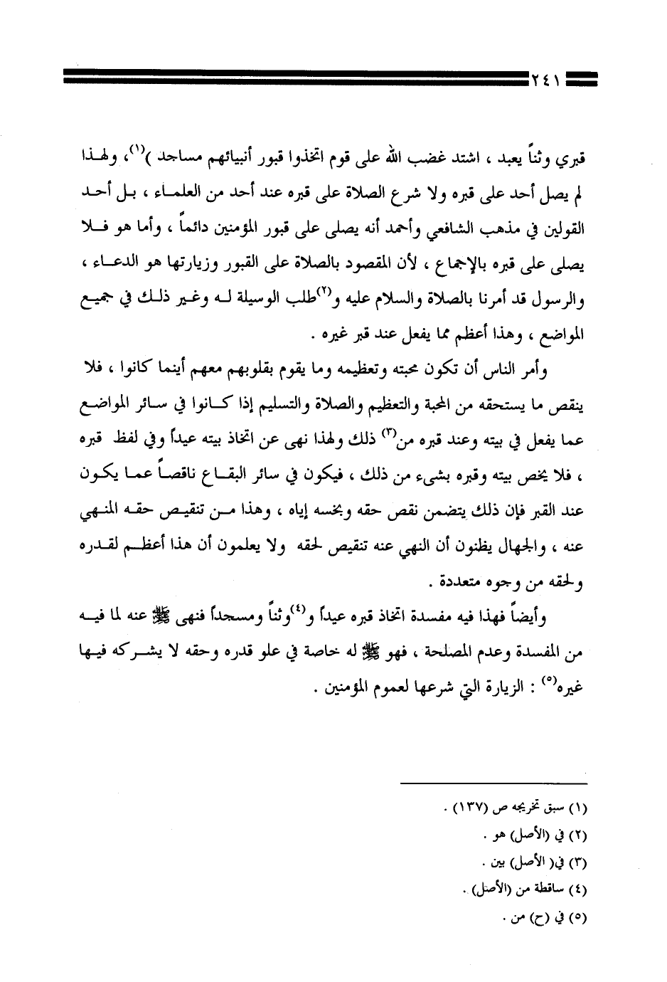 وأيضًا فهذا فيه مفسدة اتخاذ قبره عيدًا ووثنًا ومسجدًا فنهى صلى الله عليه وسلم عنه لما فيه من المفسدة وعدم المصلحة، فهو صلى الله عليه وسلم له خاصة في علو قدره وحقه لا يشركه فيها غيره: الزيارة التي شرعها لعموم المؤمنين.