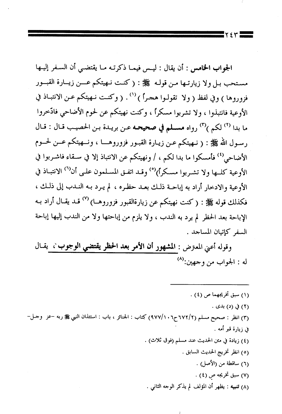 الجواب الخامس: أن يقال: ليس فيما ذكرته ما يقتضي أن السفر إليها مستحب بل ولا زيارتها من قوله صلى الله عليه وسلم: (كنت نهيتكم عن زيارة القبور فزوروها) وفي لفظ (ولا تقولوا هجرًا). (وكنت نهيتكم عن الانتباذ في الأوعية فانتبذوا، ولا تشربوا مسكرًا، وكنت نهيتكم عن لحوم الأضاحي فادّخروا ما بدا لكم) رواه مسلم في صحيحه عن بريدة بن الحصيب قال: قال رسول الله صلى الله عليه وسلم: (نهيتكم عن زيارة القبور فزوروها، ونهيتكم عن لحوم الأضاحي فأمسكوا ما بدا لكم، / ونهيتكم عن الانتباذ إلا في سقاء فاشربوا في الأوعية كلها ولا تشربوا مسكرًا) وقد اتفق المسلمون على أن الانتباذ في الأوعية والادخار أراد به إباحة ذلك بعد حظره، لم يرد به الندب إلى ذلك، فكذلك قوله صلى الله عليه وسلم: (كنت نهيتكم عن زيارة القبور فزوروها) قد يقال أراد به الإباحة بعد الحظر لم يرد به الندب، ولا يلزم من إباحتها ولا من الندب إليها إباحة السفر كإتيان المساجد.