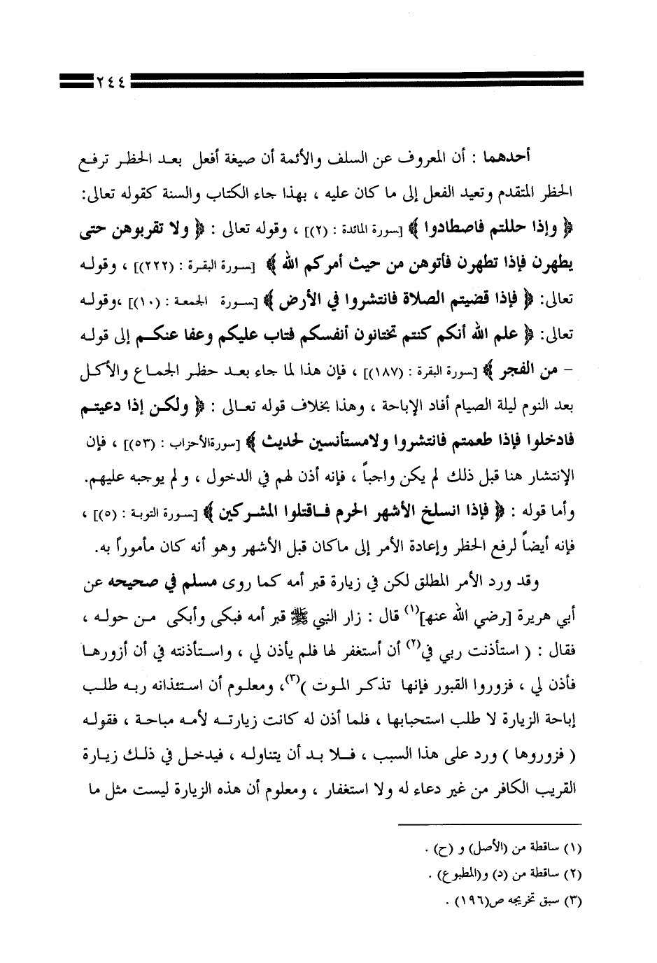 وقد ورد الأمر المطلق لكن في زيارة قبر أمه كما روى مسلم في صحيحه عن أبي هريرة [رضي الله عنه] قال: زار النبي صلى الله عليه وسلم قبر أمه فبكى وأبكى من حوله، فقال: (استأذنت ربي في أن أستغفر لها فلم يأذن لي، واستأذنته في أن أزورها فأذن لي، فزوروا القبور فإنها تذكر الموت)، ومعلوم أن استئذانه ربه طلب إباحة الزيارة لا طلب استحبابها، فلما أذن له كانت زيارته لأمه مباحة، فقوله (فزوروها) ورد على هذا السبب، فلا بد أن يتناوله، فيدخل في ذلك زيارة القريب الكافر من غير دعاء له ولا استغفار، ومعلوم أن هذه الزيارة ليست مثل ما