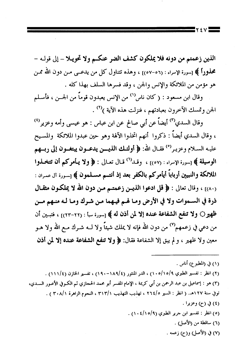 وقال ابن مسعود: (كان ناس من الإنس يعبدون قومًا من الجن، فأسلم الجن وتمسك الآخرون بعبادتهم، فنزلت هذه الآية).