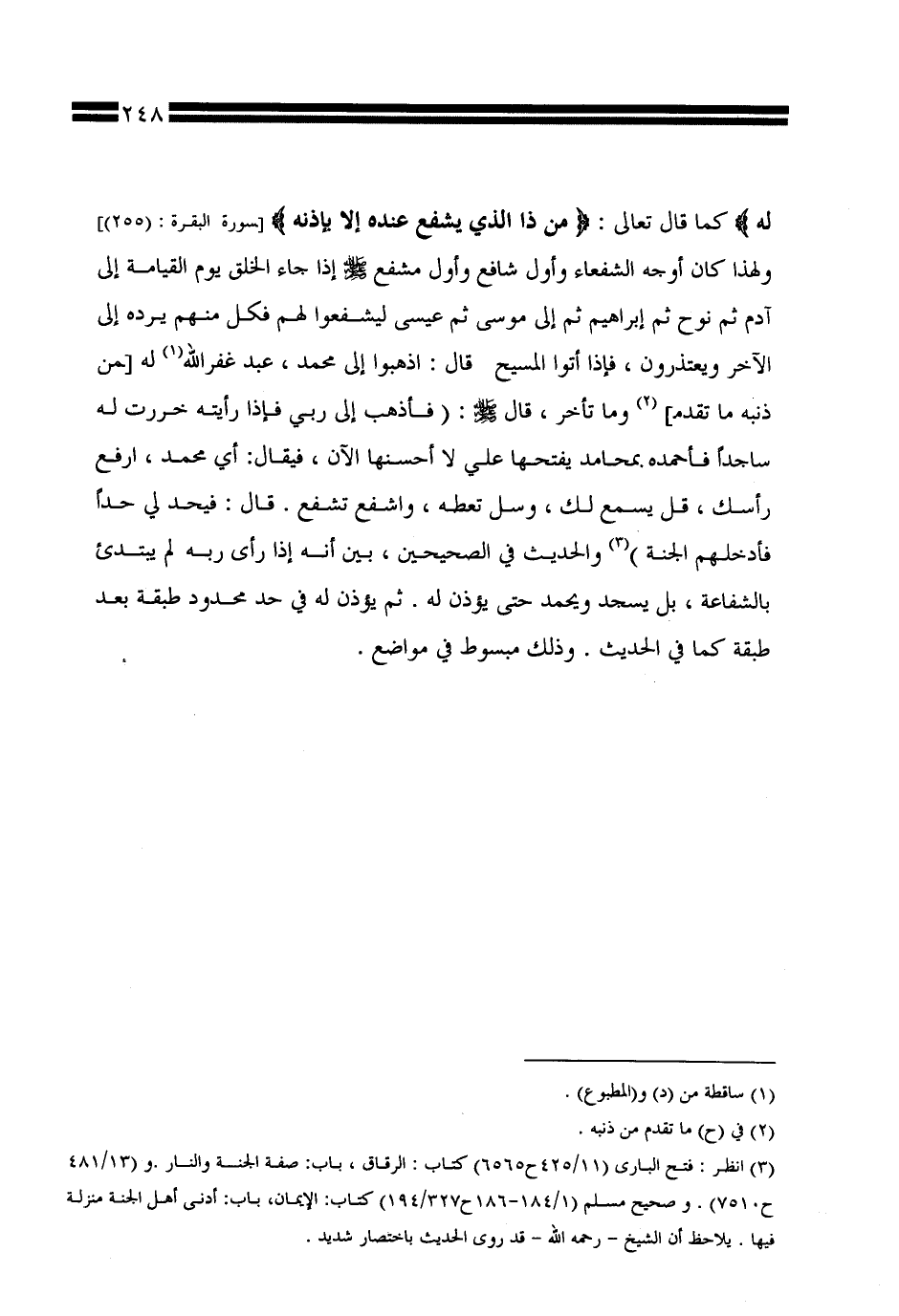 له} كما قال تعالى: {من ذا الذي يشفع عنده إلا بإذنه} [سورة البقرة: (255)]، ولهذا كان أوجه الشفعاء وأول شافع وأول مشفع صلى الله عليه وسلم إذا جاء الخلق يوم القيامة إلى آدم ثم نوح ثم إبراهيم ثم إلى موسى ثم عيسى ليشفعوا لهم فكل منهم يرده إلى الآخر ويعتذرون، فإذا أتوا المسيح قال: اذهبوا إلى محمد، عبد غفر الله له [من ذنبه ما تقدم] وما تأخر، قال صلى الله عليه وسلم: (فأذهب إلى ربي فإذا رأيته خررت له ساجدًا فأحمده بمحامد يفتحها علي لا أحسنها الآن، فيقال: أي محمد، ارفع رأسك، قل يسمع لك، وسل تعطه، واشفع تشفع. قال: فيحد لي حدًّا فأدخلهم الجنة) والحديث في الصحيحين، بين أنه إذا رأى ربه لم يبتدئ بالشفاعة، بل يسجد ويحمد حتى يؤذن له. ثم يؤذن له في حد محدود طبقة بعد طبقة كما في الحديث. وذلك مبسوط في مواضع.