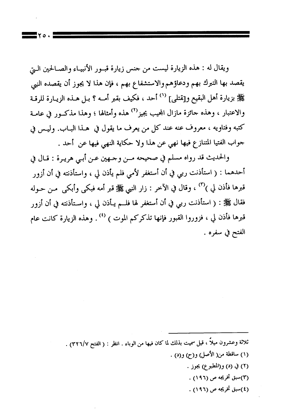 ويقال له: هذه الزيارة ليست من جنس زيارة قبور الأنبياء والصالحين التي يقصد بها التبرك بهم ودعاؤهم والاستشفاع بهم، فإن هذا لا يجوز أن يقصده النبي صلى الله عليه وسلم بزيارة أهل البقيع و [قتلى] أحد، فكيف بقبر أمه؟ بل هذه الزيارة للرقة والاعتبار، وهذه جائزة ما زال المجيب يجيز هذه وأمثالها؛ وهذا مذكور في عامة كتبه وفتاويه، معرف عنه عند كل من يعرف ما يقول في هذا الباب. وليس في جواب الفتيا المتنازع فيها نهي عن هذا ولا حكاية النهي فيها عن أحد.