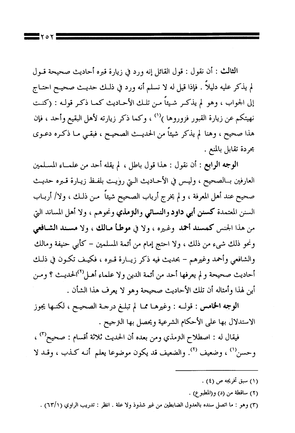 الثالث: أن نقول: قول القائل إنه ورد في زيارة قبره أحاديث صحيحة قول لم يذكر عليه دليلاً، فإذا قيل له لا نسلم أنه ورد في ذلك حديث صحيح احتاج إلى الجواب، وهو لم يذكر شيئًا من تلك الأحاديث كما ذكر قوله: (كنت نهيتكم عن زيارة القبور فزوروها)، وكما ذكر زيارته لأهل البقيع وأحد، فإن هذا صحيح، وهنا لم يذكر شيئًا من الحديث الصحيح، فبقي ما ذكره دعوى مجردة تقابل بالمنع.