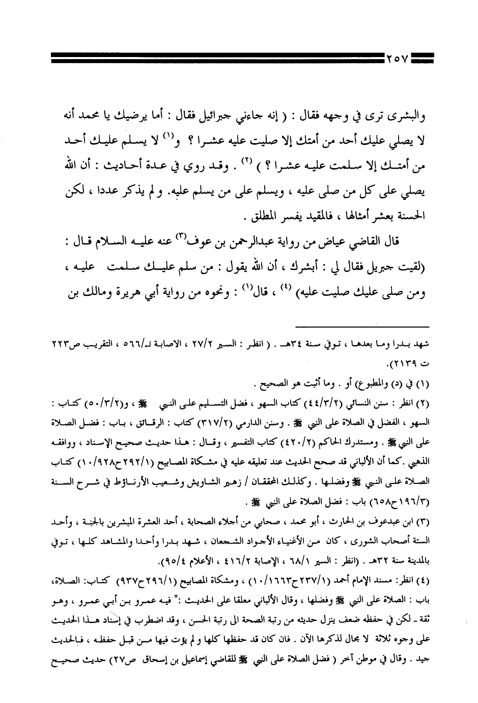 قال القاضي عياض من رواية عبد الرحمن بن عوف عنه عليه السلام قال: (لقيت جبريل فقال لي: أبشرك، أن الله يقول: من سلم عليك سلمت عليه، ومن صلى عليك صليت عليه)، قال: ونحوه من رواية أبي هريرة ومالك بن