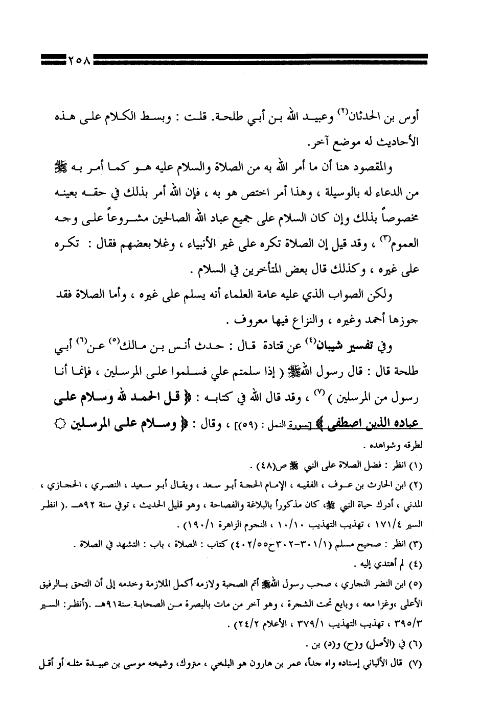 وفي تفسير شيبان عن قتادة قال: حدث أنس بن مالك عن أبي طلحة قال: قال رسول الله صلى الله عليه وسلم (إذا سلمتم علي فسلموا على المرسلين، فإنما أنا رسول من المرسلين)، وقد قال الله في كتابه: {قل الحمد لله وسلام على عباده الذين اصطفى} [سورة النمل: (59)]، وقال: (وسلام على المرسلين *